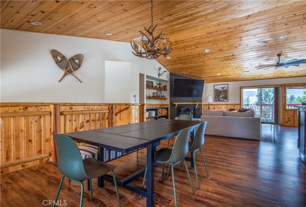 Southern exposure and ski slope views define this spacious custom log-style home in Whispering Forest. Built in 2007, the property combines scale, quality construction, and thoughtful updates in one of Big Bear’s most desirable neighborhoods. Designed with a reverse floor plan, the upper level showcases vaulted tongue and groove ceilings, expansive windows, and an open great room that captures natural light and mountain views. The living area centers around a fireplace and built-ins, while the adjacent dining space and entertainer’s kitchen flow seamlessly together. The remodeled kitchen features abundant counter space, dual islands with extra wash sink and breakfast bar seating, updated cabinetry, and a layout ideal for hosting gatherings. The primary suite is also located on the upper level and offers its own fireplace, deck access, and a spacious bath with dual vanity, soaking tub, and separate shower. Downstairs, additional bedrooms, bathrooms, and a family room provide excellent separation and flexibility for guests or extended stays. Outdoor living is a true highlight, with a long covered deck framing mountain and ski slope views and creating a natural extension of the main living space. The fenced yard includes a private hot tub and fire pit area, while the lower deck offers additional access to the backyard. Situated on a 10,710 square foot corner lot with level topography, the property provides generous parking, and a two-car attached garage. The garage is currently utilized as a finished recreation space, offering added versatility. An EV charger and recently installed HVAC system add modern convenience and year round comfort. Located just minutes from the National Forest, ski resorts, the lake, grocery stores, and dining, this home offers strong full time livability and proven short term rental appeal.