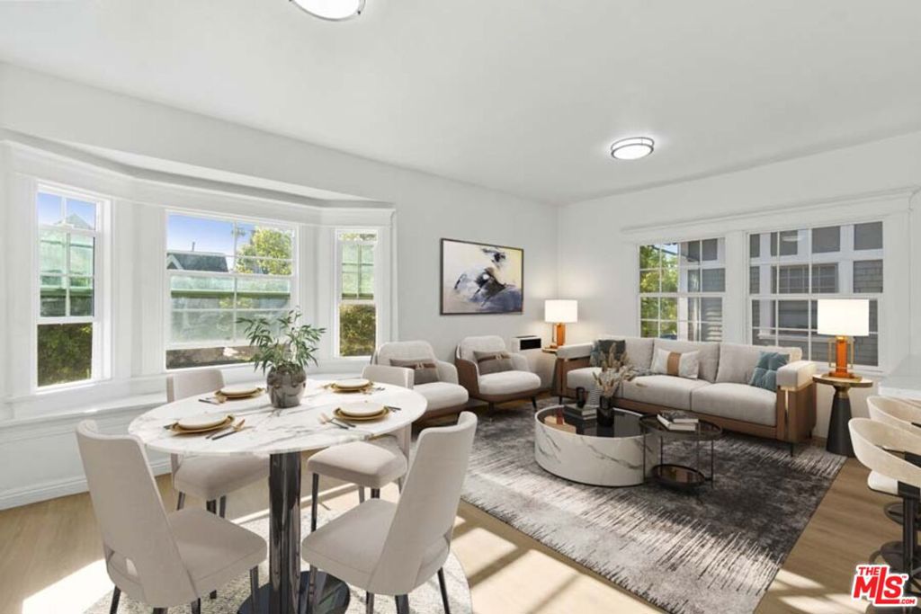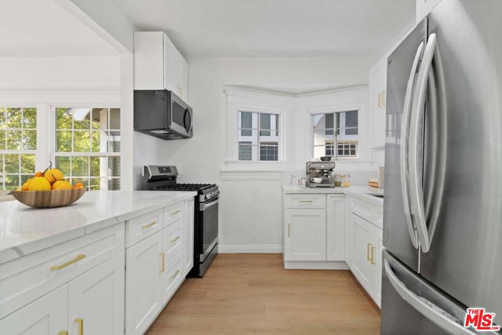 Completely Remodeled 2BD/1BA Bright Upper Unit with 2 Parking Spaces & Security! Ideally situated between 11th St and 12th St in a quiet, low-traffic neighborhood (15 mph residential zone). This second-floor unit features an abundance of natural light with an east-facing orientation and pleasant views. The unit has been fully renovated with brand-new upgrades throughout, including brand new modern kitchen appliances with new cabinets including pantry, granite countertop, refrigerator, microwave, and gas stove, waterproof flooring throughout, new dual-pane windows, and fresh interior paint. The property sits on a large 8,570 sq ft lot and offers excellent amenities: 2 parking spaces included, gated entry with automatic gate, CCTV security system, and additional guest parking available. Just minutes from DTLA, Hancock Park, and Larchmont Village, this property offers easy access to dining, shopping, and public transportation. The convenient location puts you close to Downtown Los Angeles, USC, LA Live, many restaurants and shops, and within easy reach of public transit and freeways. Available for immediate move-in. Don’t miss your chance to live in one of L.A.’s most vibrant and central neighborhoods! Virtual staging photos showcase the kitchen, living room, and primary bedroom.