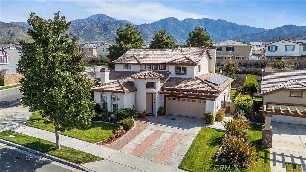 Exceptional highly desired Chapman Heights home offering space, flexibility , and indoor-outdoor living on a prime corner lot in upper Yucaipa… Surrounded by scenic mountains and foothills! Five Bedroom, three bathroom, two story and a two car garage. Well maintained by the original owners, one bedroom and full bathroom downstairs, ideal for guest and multigenerational living or a home office. The entry greets you with an attractive staircase, living area and huge formal dining or large enough for a game/pool room! The spacious kitchen with all stainless appliances, granite counters, counter top stove, island with sink and breakfast bar open to another everyday eating area plus the family room with fireplace. Two exits to the backyard a slider from everyday eating area and a single door from the family room. Indoor laundry room with overhead cabinets is downstairs and leads you to the two car garage with a plethora of storage overhead as well as shelves and a wall of cabinets. Upstairs you have four more bedrooms and two full baths a covered balcony with mountain views! Accessible form the primary bedroom as well as a secondary bedroom. Primary suite offers a separate garden tub and shower, water closet plus generous walk in closet. The backyard is very private and ready to enjoy! built in outdoor kitchen with BBQ and refrigerator, drawers and all outdoor patio furniture plus fire pit stay with the home. There is a gas line and 220 just waiting for your spa. Easy maintenance and portable steel dog run can stay. This master planned community has low HOA and offers outstanding amenities, such as picnic area, walking/jogging and hiking trails, playgrounds, dog park and very close to the Yucaipa Valley golf club, Soccer complex, Yucaipa regional park with lakes for fishing and the Yucaipa Community Park and Community Center are within walking distance! Plus, this home has purchased solar that buyer will need to assume the low balance. Don’t hesitate, great location, community and floor plan!