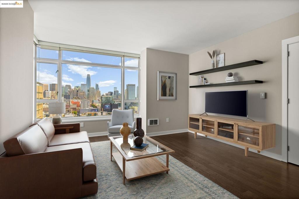 Beautiful corner condo unit with panoramic views of San Francisco (including iconic Salesforce Tower), downtown Oakland and the Bay. Remodeled kitchen with stainless steel Bosch appliances, Studio Becker cabinets, Ceasarstone countertops, recessed lighting and luxury vinyl flooring. The bonus den has been converted to a bedroom with locking door. This modern building has a 24 hour door person, complimentary coffee in the lobby along with many available artistic lounges to use as guess desire. Wait until you see the beautiful park on the 5th floor featuring greenery, luxury spa, barbecue area, fire pit, fitness club, walking trails, ping pong table, yoga room and chef’s kitchen in club room. Leased parking is available thru Ace Management . Valet parking is an option along with Bi-Weekly Housekeeping. Short walk to BART trains and other transportation. Views: Downtown