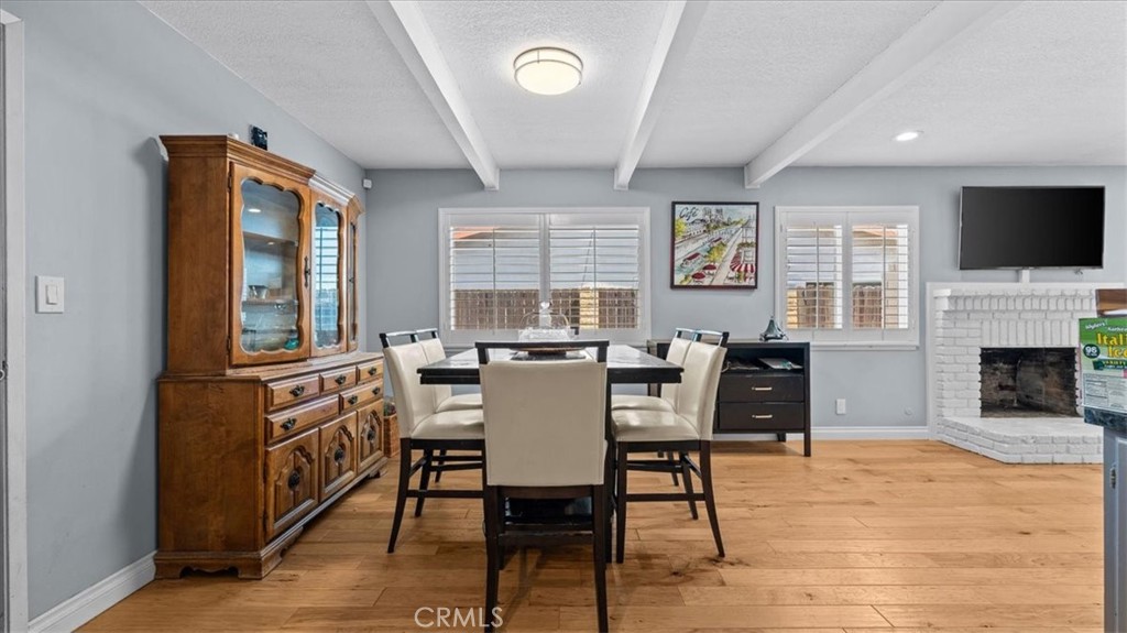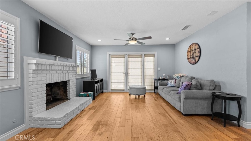 Step inside this beautiful home and be welcomed by a stunning stone fireplace in the living room, perfect for cozy gatherings. Wood flooring flows throughout, complementing the elegant kitchen with stylish cabinets, countertops, and appliances. Spacious, light-filled rooms feature large windows and new ceiling fans, creating an inviting atmosphere. This home boasts numerous upgrades, including all-new double-pane windows with shutters, fresh interior paint, and a recently upgraded HVAC system (8 years old) with new venting. The guest room includes a French door, while the master suite offers a newly remodeled bathroom for modern comfort. Additional enhancements include a new garage door opener, updated ceiling fans, and a premium Alumawood patio cover. With 4 generous bedrooms, automatic sprinklers, a durable metal roof, and both wood-burning and gas fireplaces, this home combines comfort with functionality. Outdoors, enjoy a covered back patio, open yard space, and mature avocado and orange trees—all situated on a private cul-de-sac.