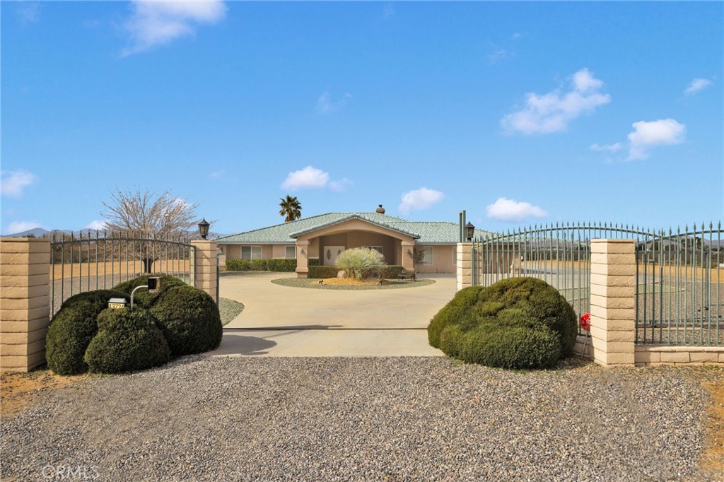 Private Gated Estate on 5 Fully Fenced Acres with Pool, Spa, Guest Quarters, Warehouse & RV Hookups Welcome to a rare and versatile private gated estate offering space, privacy, and lifestyle flexibility on five fully fenced acres with paved access and an automatic gated entry. The main residence features a desirable split-floor plan for everyday living and entertaining. The east wing includes three generously sized bedrooms and a full bathroom. The heart of the home offers a welcoming foyer, dining area, open kitchen and living space, a dedicated home gym area, and a convenient guest powder room. The west wing is dedicated to the primary suite with walk-in closet and spa-inspired bath with dual sinks, Jacuzzi tub, separate shower, and enclosed water closet. A laundry room, garage, and office with closet and window complete this wing. Step outside to a resort-style backyard with a large in-ground pool with diving board and heated spa, surrounded by a solid wall enclosure for privacy. The expansive pool deck is ideal for entertaining and year-round desert living. A charming, fully fenced garden area adds more outdoor enjoyment. The property includes a pool house/guest quarters (approx. 600–650 sq ft) with A/C, heater, swamp cooler, and a ¾ bathroom (shower, toilet, sink) — great for guests, studio use, or future customization. A standout feature is the large warehouse, approximately the size of the main home, with its own restroom, 50-amp RV hookup, shaded RV parking, and separate internal fencing. The warehouse is currently income-producing, providing optional income potential. Additional highlights include: • Fully fenced property with internal separation for privacy • Automatic gated entry with paved driveway and minimal dirt road access • Well water and propane utilities for independent living • RV-ready infrastructure • Excellent for business owners, multi-generational living, hobbyists, or those seeking space and versatility This one-of-a-kind High Desert property offers a rare blend of functionality, privacy, and lifestyle amenities — all just minutes from town with easy paved access. A truly unique estate with endless possibilities.