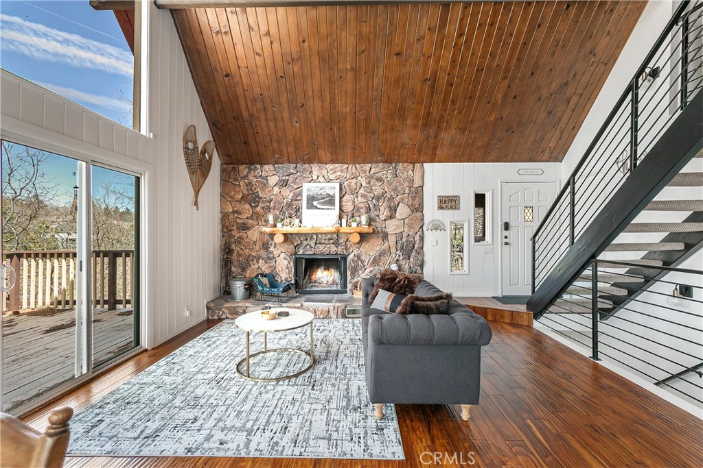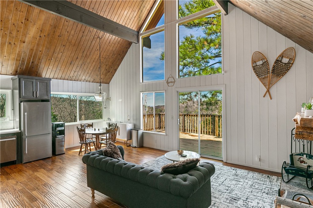 Treehouse Vibes with Lake Rights & Unbelievable Views! Welcome to your peaceful mountain escape in the coveted Lake Arrowhead lake rights area! Nearly level entry with just one easy step to the front door, situated on a paved and maintained road. This home feels like a private treehouse retreat, nestled among towering pines with no visible neighbors in sight—just endless natural beauty. Enjoy the convenience of a huge driveway that can comfortably accommodate 3–4 cars, depending on size—plenty of room for guests or multiple vehicles. Step inside to soaring A-frame beamed ceilings and a spacious open-concept living area featuring a stunning rock fireplace. The living room and kitchen are perfectly positioned to take in jaw-dropping panoramic views of national forest, dramatic boulders, rolling hills, and vibrant greenery—so surreal they look like a painting. The updated kitchen offers modern cabinetry, sleek countertops, and a stylish backsplash, flowing seamlessly into a large dining area that easily seats eight. Two bedrooms are located on the main level, each with views of the forest and their own closets. The updated bathroom on this floor features chic tile, a modern vanity, and a walk-in shower. Upstairs, the airy loft bedroom boasts two oversized closets and awe-inspiring views through the A-frame windows that match the ones seen from the expansive upper deck. Downstairs is a spacious bonus living area, currently used as a TV and game room with a second rock fireplace—perfect for entertaining or converting into a fourth bedroom. A serene additional bedroom with bold blue lake-inspired tile and a generous storage room (the size of a bedroom) complete this level. Two levels of large decks offer plenty of space for relaxing or hosting guests, all while soaking in the unmatched beauty of Lake Arrowhead’s natural landscape. Whether you’re looking for a full-time residence, a second home, or a short-term rental investment—this is the treehouse-style cabin of your dreams.
