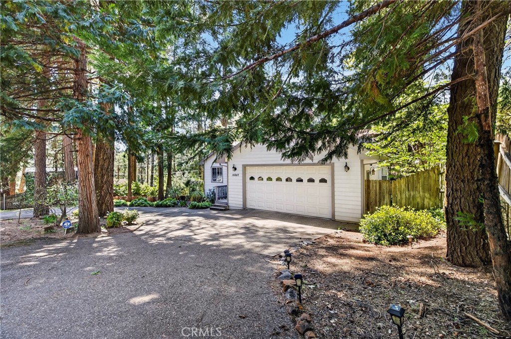 Nestled in the beautiful Magalia Pines is this One Owner Custom Built Home that is ready for a new owner. The owner had the plans drawn and completed the custom home in 2005. Wonderful curb appeal and a circle driveway welcomes you and your guests to the home. The home has an oversized 525 square foot 2-car garage. The composite front deck leads to a 9-foot covered front porch measuring 10X10 and accented with a knotty pine tongue and groove ceiling. The custom wood front door has a glass inlay. Upon entry you notice the open floor plan and the amazing 12-foot vaulted wood beam knotty pine ceiling and 9ft. ceilings throughout. The spacious living room has a custom gas fireplace with tile surround and beautiful wood mantle finishes the space. The large slider and windows open the views of the forest and the ever-changing forest views. The over 200 square foot deck is a fantastic place to entertain. The spacious kitchen has a 10-foot breakfast bar, travertine tiles counters, free standing propane oven/range, dishwasher, built in microwave, garden window and upgraded pull out drawers in the cabinets all overlooking the living room and dining room. Off the kitchen is a large laundry room with utility sink and large built in storage cabinets. Down the over 4-foot-wide hallway are two large built-in cabinets and the bedrooms and baths. The fantastic primary bedroom has great views of the forest through an 8-foot-wide picture window, and the primary bath offers 2 sink vanity with travertine tile counters, fully tiled shower with sliding glass doors and a huge walk-in closet. The guest bath offers a tub/shower combination with tiled walls, sliding glass doors and a tiled vanity with tile backsplash. Fully fenced side and backyard. Definitely enough room to develop boat, R.V. or trailer parking. The exterior of the home has cement style lap siding. The home is very warm and inviting and is ready for a new owner.
