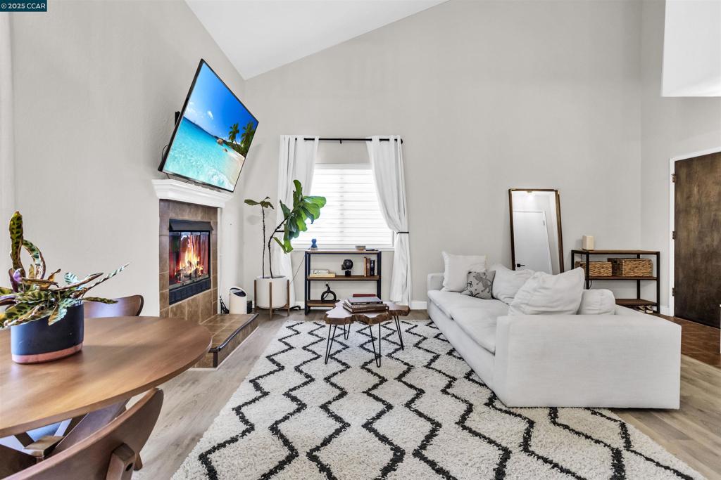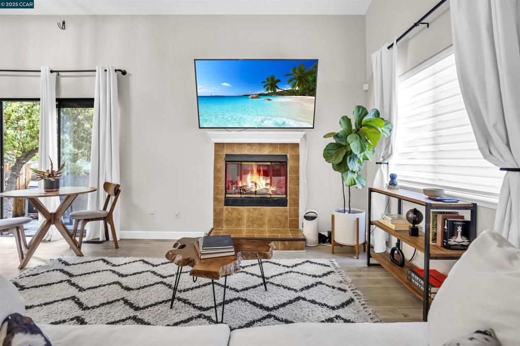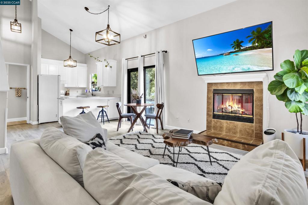 Stylishly Updated Townhome in Prime Concord Location: This beautifully updated 2-bed, 2-bath townhome offers a bright, open layout with vaulted ceilings, a cozy gas fireplace, and plenty of natural light. The modern kitchen features quartz countertops, white cabinetry, and a breakfast bar, flowing seamlessly into the main living area. A full bath is conveniently located on the first floor. Upstairs, enjoy a spacious primary bedroom with mirrored closets and a private balcony, plus a second bedroom and full bath. The private backyard includes a paved patio, grassy area, and mature trees—perfect for relaxing or entertaining. Includes a 2-car attached garage and is close to downtown Concord, BART, freeways, shopping, dining, and top-rated schools.