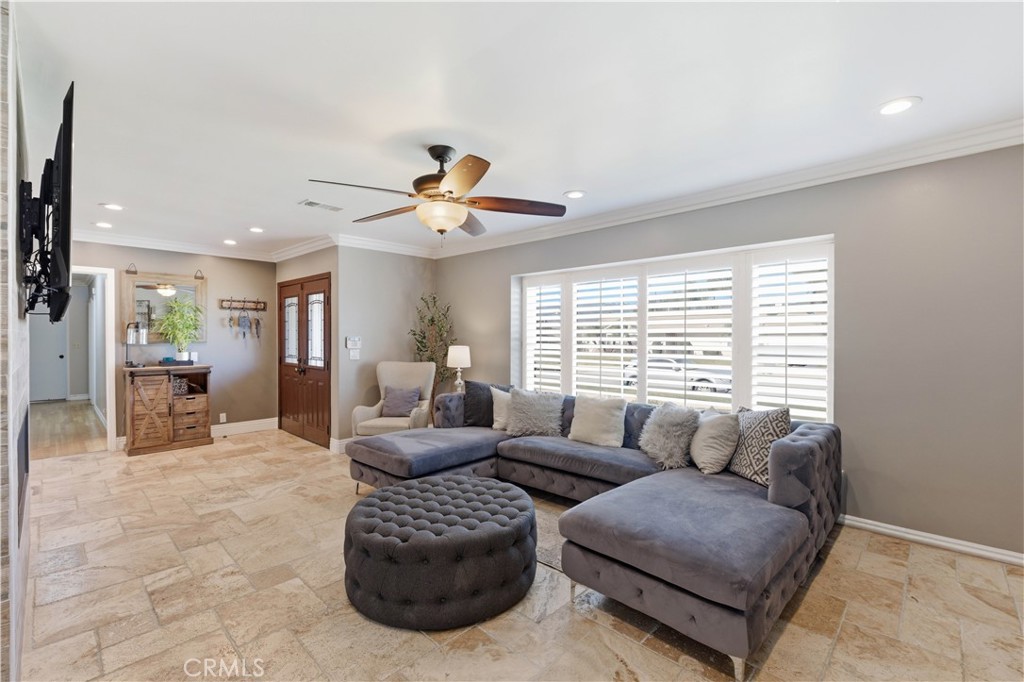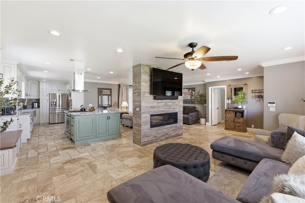 Welcome to this beautifully fully renovated 4 bedroom, 3 bathroom home offering 1,939 SqFt of thoughtfully upgraded living space on a spacious lot with RV access and modern energy-efficient features. From the moment you arrive, you’ll appreciate the pride of ownership showcased by the manicured landscaping, charming brick accents, and inviting curb appeal. Step inside to discover a completely renovated interior featuring stunning travertine flooring throughout, creating a warm yet sophisticated feel. The open-concept layout seamlessly connects the living, dining, and kitchen areas perfect for both everyday living and entertaining. A striking see-through fireplace serves as a centerpiece, elegantly dividing the living spaces while adding architectural charm and ambiance. The upgraded kitchen offers abundant cabinetry, stainless steel appliances, and a spacious island ideal for gatherings. Step outside to your private backyard retreat featuring lush grass, mature landscaping, a covered patio, and a tranquil fountain perfect for relaxing evenings or hosting guests. The expansive lot provides RV parking access and includes 220V connections ready for electric vehicle charging, offering convenience for today’s modern lifestyle.