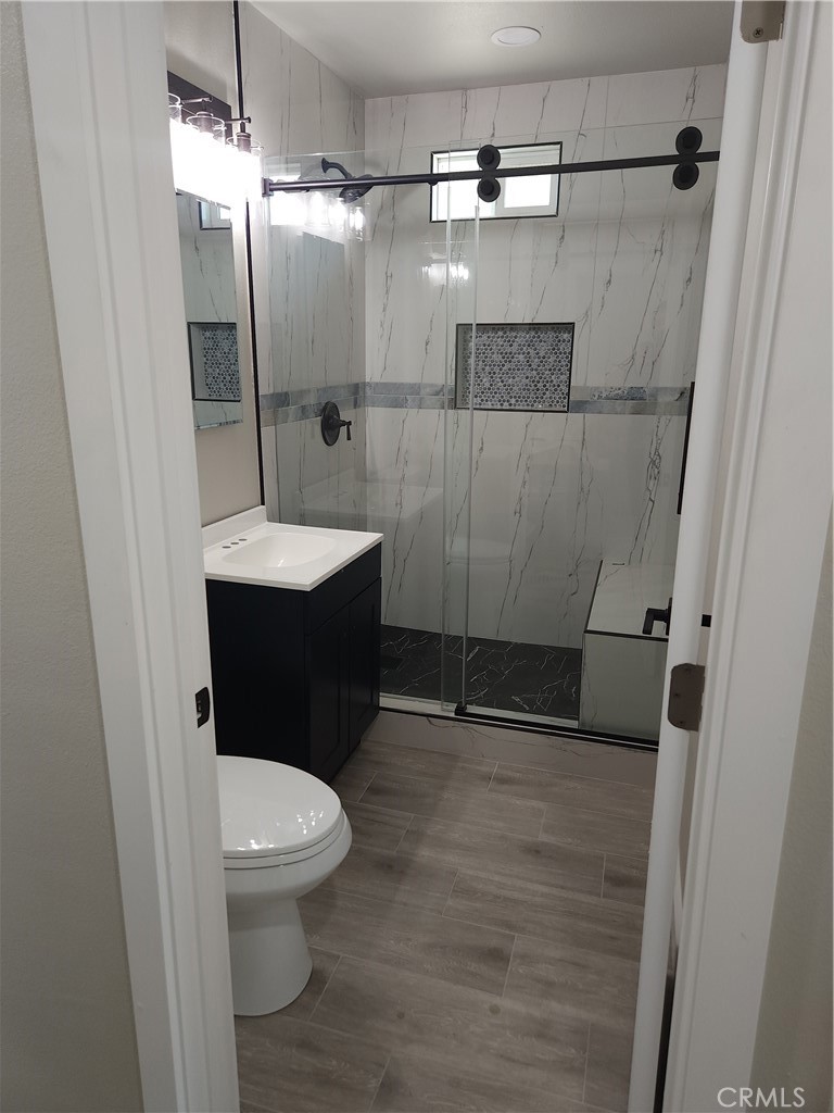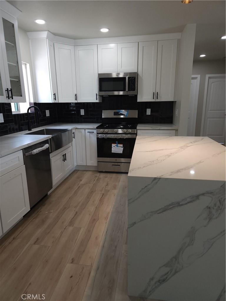 Welcome to this beautifully remodeled 3-bedroom, 1-bath home offering modern upgrades, an open layout, and true turnkey convenience. Step inside to find stunning wood plank flooring flowing seamlessly throughout, complemented by fresh interior paint and new baseboards that create a clean, contemporary feel. The fully renovated kitchen is a standout feature, showcasing brand-new soft-close cabinetry, elegant waterfall quartz countertops, and a stainless steel farmhouse sink. The completely open floor plan connects effortlessly to a spacious family room, while brand-new windows flood the home with abundant natural light. The upgraded bathroom features a large, beautifully designed walk-in shower, providing a spa-like experience. All three bedrooms are generously sized and offer ample closet space for comfort and functionality. Additional upgrades include brand-new central A/C for year-round comfort, tank less water heater and an attached garage for convenience. Step outside to a large backyard, perfect for entertaining, relaxing, and enjoying added privacy. Ideally located within walking distance to schools, with close proximity to shopping, dining, and easy freeway access, this home truly has it all. Move-in ready and waiting for its next family to enjoy!