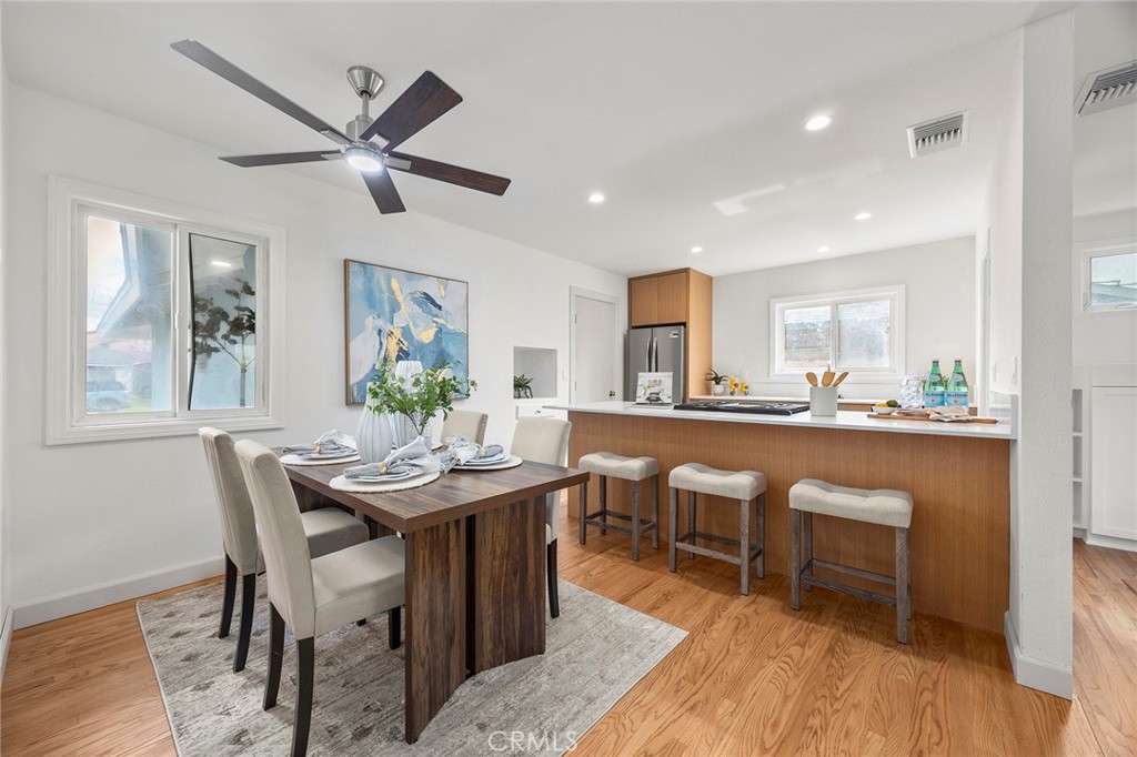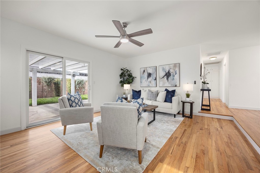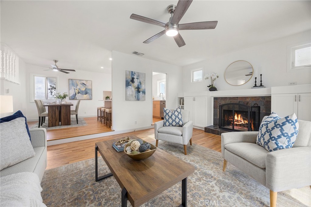 Recently renovated and move-in ready, this beautifully updated 3-bedroom, 2-bathroom single-level home offers 1,137 sqft of living space on a generous 6,200 sqft lot in desirable Huntington Beach—just a 15 minute drive to the beach! From the moment you arrive, you’ll appreciate the expansive front lawn and inviting curb appeal. Step inside to find beautifully refinished original hardwood flooring that flows throughout the entire home, including all bedrooms, creating warmth and continuity. The brand-new kitchen is a true highlight, featuring stunning quartz countertops, a convenient breakfast bar, recessed lighting, and new stainless steel appliances. New baseboards throughout the home add a crisp, modern touch. The dining area, living room and primary bedroom all feature ceiling fans for added comfort. Step down into the spacious living room where you’ll find built-in cabinetry and an inviting fireplace—perfect for relaxing evenings. A sliding glass door opens to the large backyard, complete with a patio cover and plenty of space with endless possibilities for outdoor entertaining, gardening, or future customization. The primary suite includes an ensuite bathroom with a walk-in shower and tile enclosure. Two additional bedrooms and a full bathroom complete the well-designed floor plan. Conveniently located near three elementary schools, Marina High School, Glen View Park, and a variety of local amenities including shopping and dining. With the beach just minutes away, this home offers the ideal blend of comfort, convenience, and coastal living. Don’t miss this opportunity—schedule your showing today!