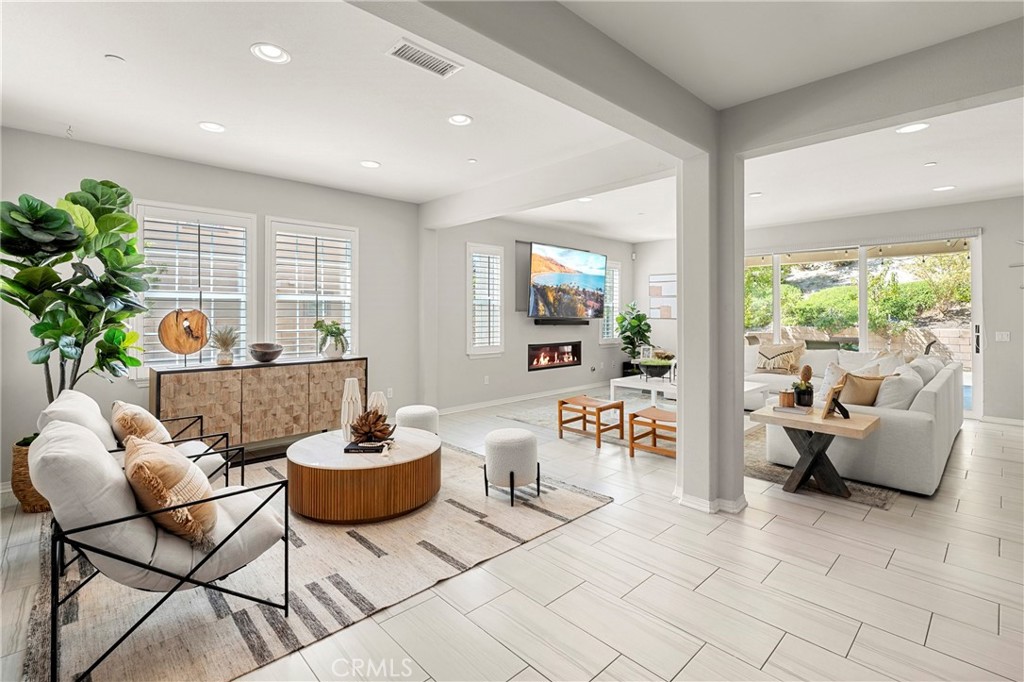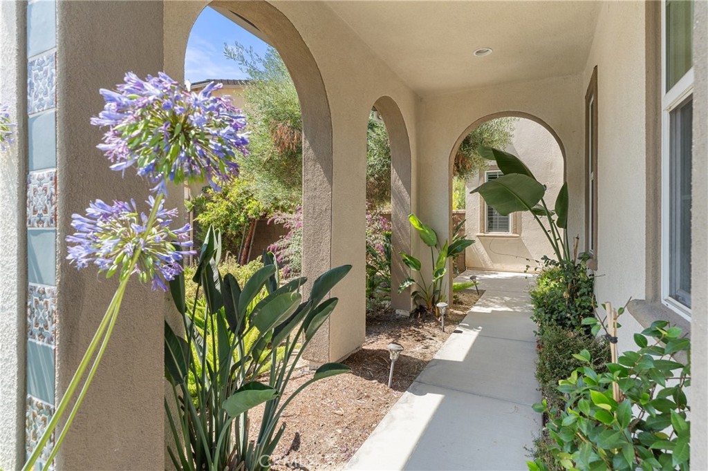 Tucked away in the coveted Serena at Vila Borba, this exceptional Plan 3 residence, built by Standard Pacific Homes, offers the pinnacle of style, comfort, and functionality. Spanning an impressive 3,100 square feet of living space, this home features 5 bedrooms and 3.5 bathrooms, making it the largest floorplan in the Serena tract. From the moment you step inside, contemporary upgrades set the tone. Custom window coverings, elegant granite countertops in the gourmet kitchen, and a sleek, low profile fireplace in the living room create an inviting atmosphere wrapped in luxury. The kitchen blends high end style with everyday function, featuring upgraded stainless steel appliances including a Thermador 36 inch Professional Series gas rangetop, a large center island with counter height seating, and a walk in pantry with an adjoining prep area. A builder upgraded three panel sliding glass door seamlessly connects the living room to the backyard, flooding the home with natural light and creating a perfect indoor-outdoor flow. The thoughtfully designed layout also includes a main floor guest suite, an attached three car garage with epoxy flooring, and a lavish primary suite featuring a custom built-in closet and a private covered balcony. Sustainable living is built in with an owned 23 panel Tesla Premium Solar System. The backyard offers a lush, fruitful escape with peach, donut peach, almond, and lemon trees. Residents of Vila Borba enjoy manicured community spaces, scenic walking paths, multiple parks, and rolling hill views. Perfectly situated for commuters, this home offers quick access to the 71, 91, and 60 freeways, plus upscale shopping and dining at the highly sought after Shoppes at Chino Hills. Luxury, convenience, and community, this home truly has it all!