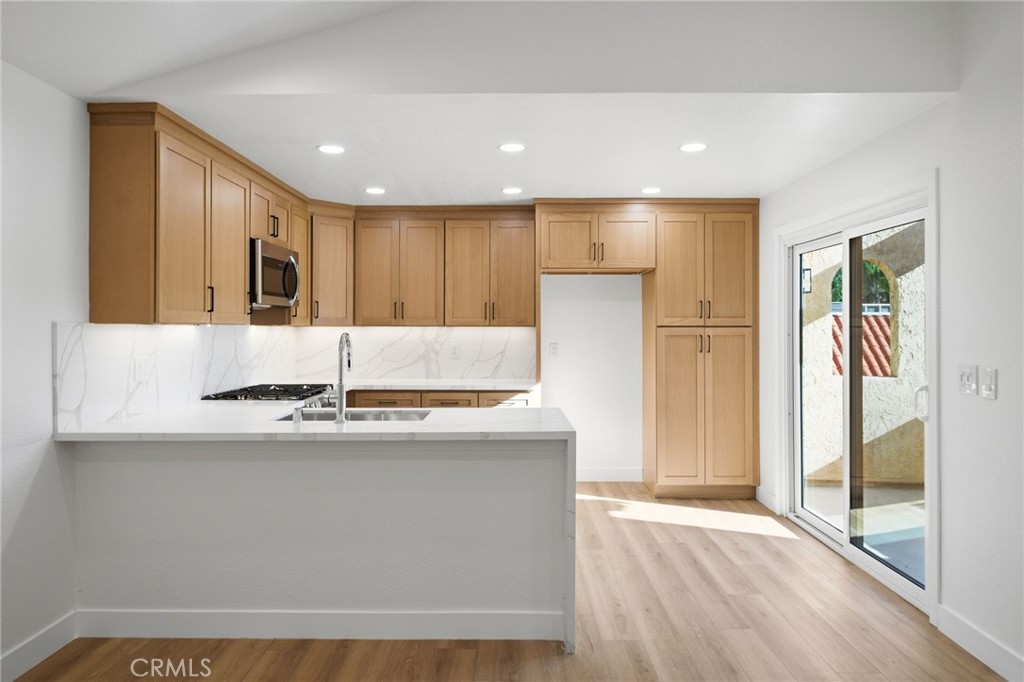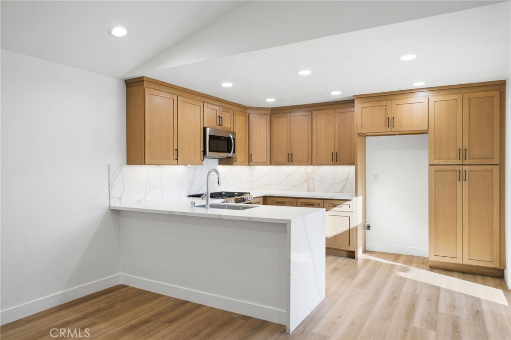 Welcome to this beautifully remodeled 1-bedroom, 1-bath condo in the highly desirable Fountain Crest Community, a rare opportunity featuring no neighbors below, offering enhanced privacy and quiet living. This thoughtfully upgraded home showcases modern finishes throughout, including durable SPC laminate flooring and a fully remodeled kitchen designed for both style and function. The kitchen features soft-close oak shaker cabinetry, Calacatta Gold quartz countertops, and a stunning waterfall peninsula that is perfect for cooking, casual dining, or entertaining. Brand-new stainless steel appliances complete the space with a sleek, contemporary touch. The bathroom has been elegantly redesigned with a floor-to-ceiling tiled shower, a full-length built-in shower ledge for convenient storage, and a quartz-topped vanity. The hallway closet features custom built-in cabinetry, maximizing storage while maintaining a clean and organized aesthetic. Additional highlights include in-home washer and dryer hookups, central air conditioning, and an oversized single-car garage conveniently located nearby. Residents of Fountain Crest enjoy resort-style HOA amenities, including a pool, spa, and outdoor cooking area, perfect for relaxing or gathering with friends and neighbors. Ideally located near top-rated schools, major freeways, shopping, and the expansive green spaces of Mile Square Regional Park, and just a short drive to the beautiful beaches of Huntington Beach, this home offers the perfect blend of comfort, style, and convenience.