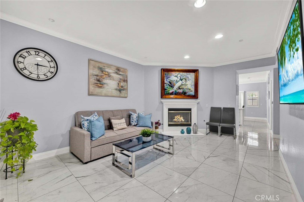 Experience the height of sophisticated, easy living in this rare, single story gem, perfectly situated in a 55+Fountain Valley Community. Designed for absolute convenience, this residence features a completely step-free lay out, offering total accessibility without compromising on style. Built in 2004 and spanning 1,156 square feet, the home has been elegantly reimagined with high-end finished. The heart of this luxury retreat is the stunning remodeled kitchen, showcasing white quartz countertops, a designed tile backsplash, and brand-new tile flooring that flows beautifully into the main living areas. The open-concept floor plan invites you into a large, sun-filled living room anchored by a classic fireplace. The primary suite serves as a privately oasis with a generous walk-in closet and a dual-sink vanity. While the second bedroom is served by a full bath featuring shower-over-tub lay out. Practicality meets luxury with a dedicated laundry room and direct access to an attached garage. Step through double glass doors to your private back porch where you are greeted by lush green belt views and sparkling pool. Whether you are enjoying a quiet morning stroll through the manicured grounds or watching the sunset over the park like landscape. The low monthly fee covers comprehensive exterior maintenance, including the roof and professional landscaping all for only $308. a month. Update home this property offers a refine lifestyle of comfort and exceptional value. make it a must see.
