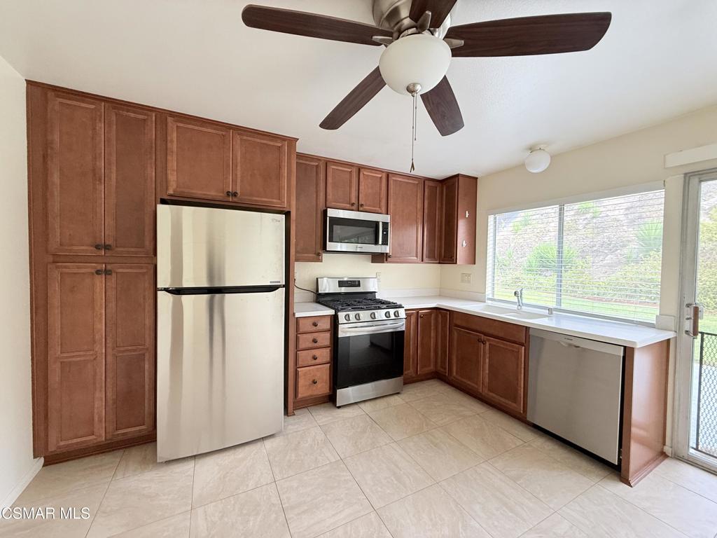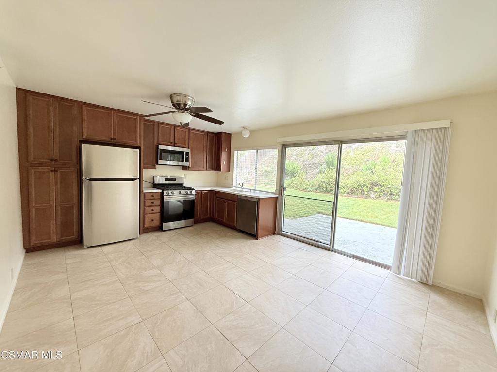 Great 4 bedroom, 2 bath single level home in the Oak Brook area of Thousand Oaks. This home has everything you need to call it home. The living room is light and bright with hard flooring and leads to a nice size kitchen with dinning area (it is large enough to use it as a small family room). Kitchen has stainless steal appliances, solid surface counter tops, a window over the sink and a slider looking out over the large back yard with grass and a hill giving you privacy. All 4 bedrooms have new carpet, one has double doors and could also be used as an office/den (it does have a closet). The home has an attached two car garage with built-ins. Close to shopping centers, restaurants, parks, gyms and more. The neighborhood has greenbelts and walking paths. Will consider pets with additional deposit (No Cats). Adult applicants must have good credit (700 or above).