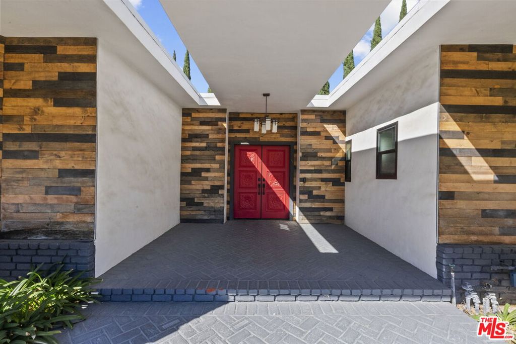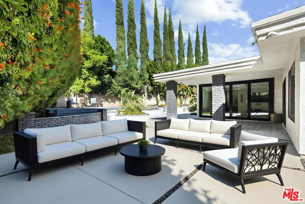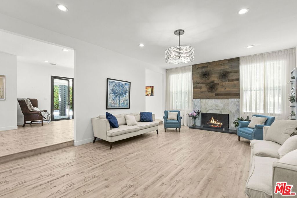 Step inside this elegant single-story home in Northridge’s coveted Devonshire Highlands, where modern design meets timeless comfort. Spanning nearly 2,800 sq ft on an almost 13,000 sq ft lot, this 4-bedroom, 4-bath retreat welcomes you with an airy open layout, high ceilings, and abundant natural light from modern sliding doors that frame the lush greenery outside. The formal entry leads to a sophisticated living room with a striking marble-and-wood fireplace and calming neutral tones. The chef’s kitchen is the heart of the home, showcasing an enormous center island, quartz countertops, custom cabinetry, and stainless steel appliances, flowing seamlessly into the family room with accordion glass doors that open to the backyard for effortless indoor-outdoor living.The dining area offers elegance with a modern chandelier and large sliding doors, ideal for family gatherings or entertaining guests. The primary suite is a private retreat featuring a spa-inspired bath, soaking tub, and a spacious walk-in closet. Nearly every bedroom includes its own walk-in closet, ensuring comfort and functionality throughout. Additional highlights include recessed smart lighting, newer windows, modern bathrooms, a 3-car garage, a huge backyard with mature trees that enhance both privacy and beauty. A covered patio outdoor with spacious deck, and newly refreshed landscaping make this home perfect for relaxation or entertaining. With designer finishes, modern upgrades, and a cul-de-sac location near top-rated schools, shops, and dining, this home captures the essence of modern California living.