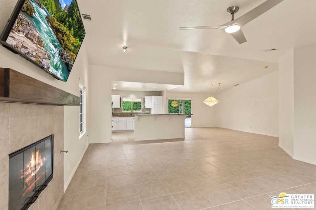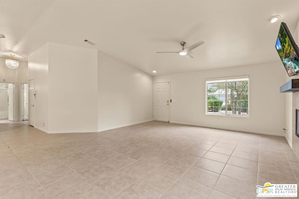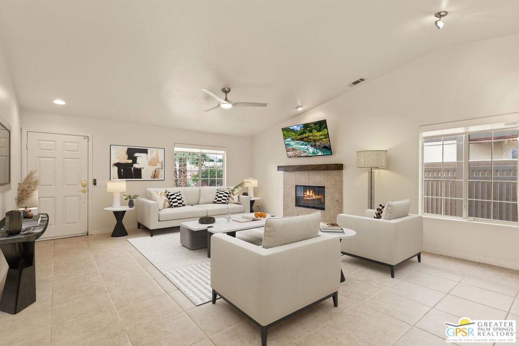 Refreshed! Revitalized! Ready for move in and your personal touch. Nestled in the South End of Palm Springs, this three-bedroom, two-bath, energy efficient home with 21 owned solar panels combines desert tranquility with convenience and economy. Located in a secluded neighborhood, yet less than 1.5 miles from shopping and restaurants, it offers a peaceful retreat that remains closely connected to the life of the city. Inside, an open floor plan filled with natural light creates a welcoming atmosphere. The living room, with its fireplace, flows into a kitchen featuring granite countertops, ample work space, and modern appliances. A versatile dining area, accented by a striking chandelier-style light fixture, can easily shift from casual meals to more formal gatherings. The larger-than-average for this size home 21-panel solar system reduces and eliminates electrical bills especially during the hot summer months. The primary bedroom, two additional bedrooms (one for guests and one for an office), ceiling fans throughout, a dedicated laundry area, and double car garage, add to the home’s comfort and functionality. Out back, a private yard with a pebble tech pool and spa offer a personal resort experience just steps from the door. Mature landscaping and citrus trees form a calm, secluded oasis. A covered patio invites outdoor dining and entertaining. Recreation is close at hand: Tahquitz Creek Golf Course and its driving range, city pickleball courts, the CV Link walking and biking path, and numerous hiking trails are all nearby. Together, these features make this home an appealing choice for anyone seeking a comfortable, efficient and economical home that fully embraces the Palm Springs lifestyle. Furnishings shown are digitally generated and not in the home.