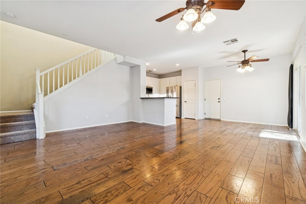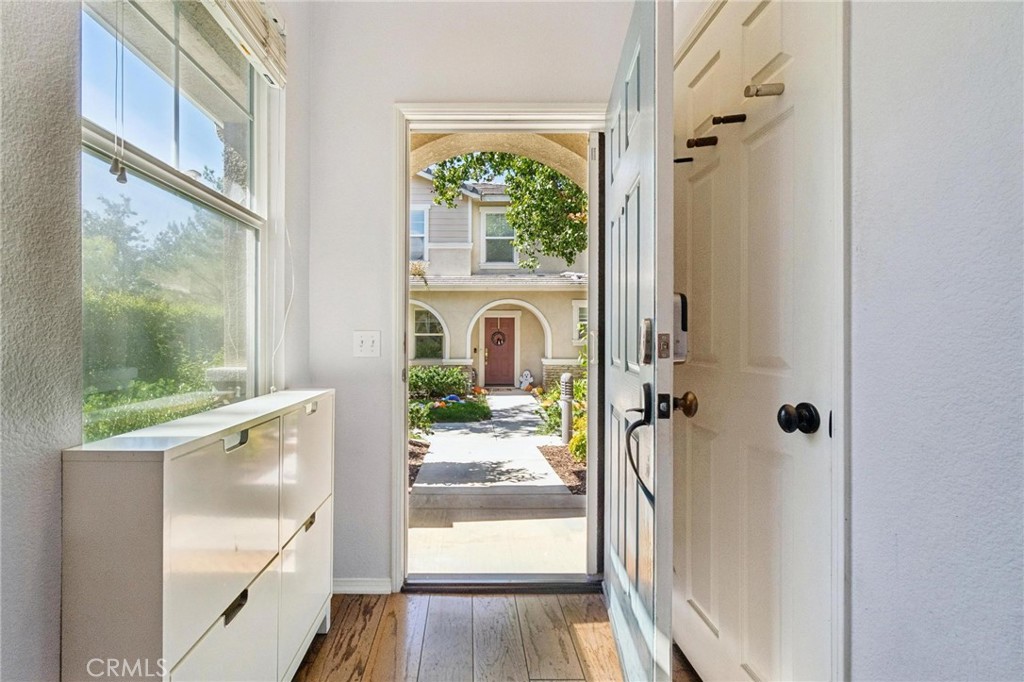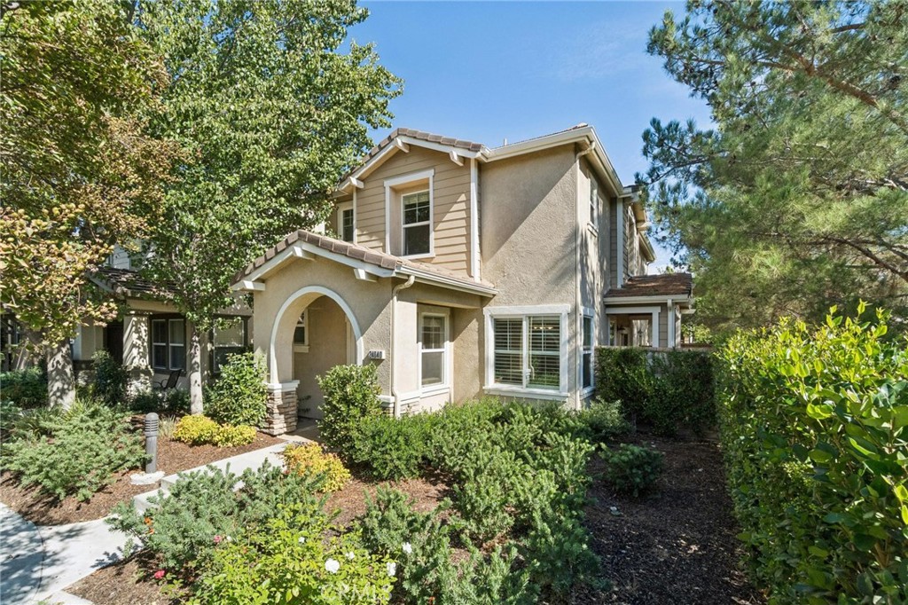 Beautifully updated Valencia home in a peaceful, tucked-away location! Rich hardwood flooring flows throughout the main level into the open kitchen featuring white cabinets, striking black quartz countertops, stainless steel appliances, and updated lighting. The spacious living and dining areas open seamlessly to a private patio yard — ideal for morning coffee or evening gatherings. Plantation shutters and designer touches add warmth and style throughout. Upstairs, all three bedrooms provide comfort and privacy, including a generous primary suite. Enjoy the Valencia Creekside community with low HOA dues, miles of scenic paseos, a clubhouse, and pool/spa amenities. Just minutes from shopping, dining, parks, and freeway access, this turnkey home blends modern upgrades with everyday convenience. No mello roos tax!