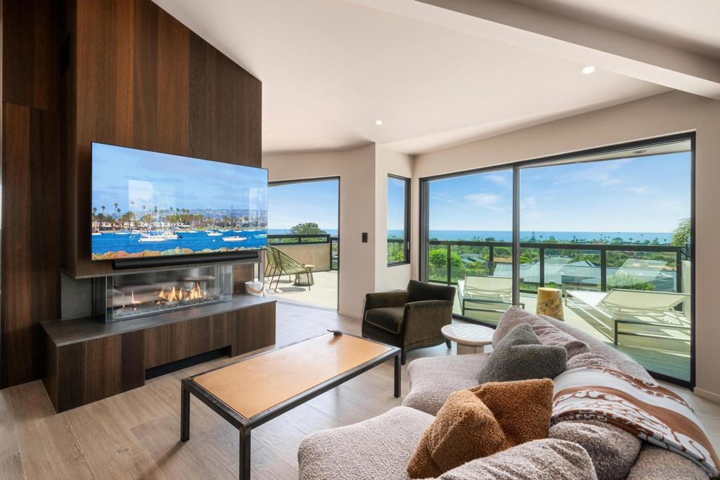Welcome to your private luxury retreat in Solana Beach, where panoramic ocean views, modern elegance, and a resort-style setting define this newly renovated 4 bed, 4.5 bath coastal haven, just minutes from the ocean. The open main level features a gourmet kitchen with oversized island, high-end appliances, bar seating, and two casual dining areas with views. A formal dining room adds sophistication for elevated entertaining. Floor-to-ceiling glass doors lead to a spacious middle deck with panoramic views, outdoor seating, and al fresco dining. The living room centers around a custom fireplace and plush sectional, seamlessly connecting to the backyard. Outside, enjoy a pool and spa surrounded by lush greenery, a putting green, trampoline, and a separate grassy lawn. The fully equipped outdoor kitchen includes a pizza oven, barbecue, fridge, and bar seating beside a firepit lounge—perfect for sunset moments. The primary suite offers a king Tempur-Pedic bed, fireplace, soaking tub, rain shower, double vanities, vanity space, and a sunlit walk-in closet. Additional rooms include a second king suite with yard access, a queen suite with deck access, and a fourth bedroom with a queen sleeper sofa that doubles as a home workspace. The home also includes a full laundry room with storage, an outdoor shower, one-car garage, two driveway spaces, and ample street parking. Sleeping Accommodations (Maximum Occupancy 8): Bedroom 1 – 1 King bed Bedroom 2 – 1 King bed Bedroom 3 – 1 Queen bed Bedroom 4 – 1 Queen Sofa bed There are a total of 5 bathrooms – 4 full baths and 1 half bath