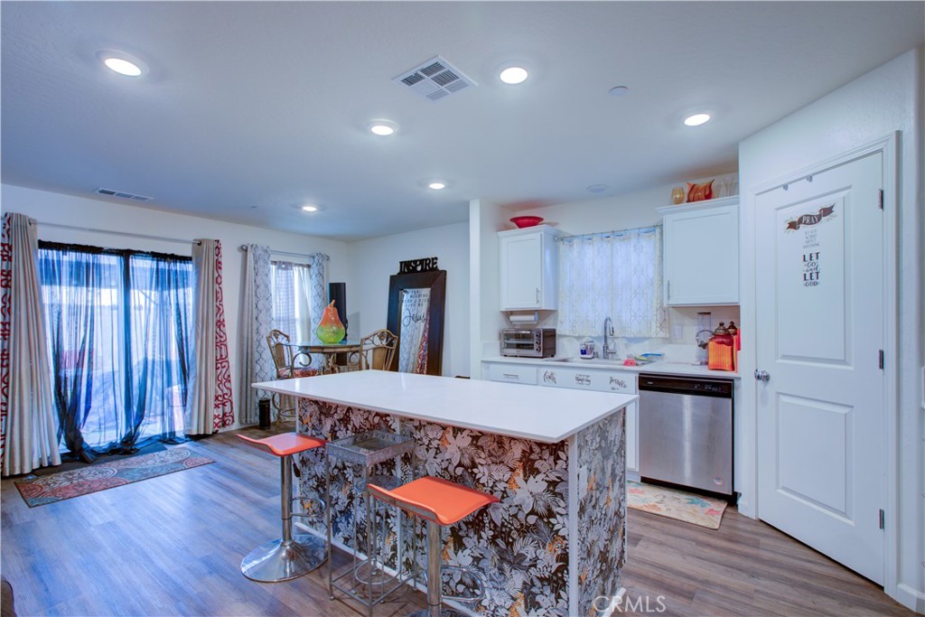 Step into this stunning contemporary style home, where modern architectural lines meet a vibrant, high-energy interior. This single-story gem boasts incredible curb appeal with its clean stucco facade and a manicured front yard that welcomes you home. Inside, the open-concept living space is bathed in natural light, highlighted by recessed LED lighting and sleek wood-look laminate flooring that flows throughout the residence. The heart of the home is a gourmet kitchen designed for both function and flair, featuring crisp white cabinetry, stainless steel appliances, and a massive waterfall island. Retreat to the spacious primary suite, a true sanctuary featuring a walk-in closet and celling fan. The modern bathrooms offer a double-vanity primary bath and a secondary bath with a shimmering, ornate finish. Designed for effortless indoor-outdoor living, the sliding glass doors lead to an expansive, low-maintenance paved backyard. This private oasis is fully fenced and features a sleek gazebo and a practical storage shed, perfect for weekend entertaining or quiet relaxation. Sustainability meets style with integrated fully owned solar panels, ensuring this energy-efficient corner-lot property is as smart as it is beautiful.