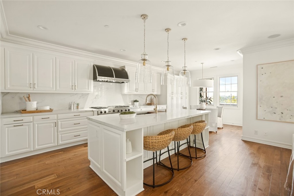Panoramic evening light, sunset and valley views provide an ever-changing backdrop for luxury living at this ideally positioned Ladera Ranch estate. Located in Alisal at the end of a tree-lined cul-de-sac street behind the guard-gated entry of Covenant Hills, the home reveals its outstanding interaction with outdoor living spaces. Guests are welcomed beyond a custom arched trellis, down a long custom-finished driveway, and through a gated entry courtyard with enchanting tile wall feature. Indoors, a quest for ageless design that transcends trends and grows richer over time is immediately apparent. A rotunda foyer with inlaid tile medallion flows effortlessly to a formal living room with stone fireplace, and a formal dining room with built-in cabinetry and French doors leading to a private fireplace-warmed courtyard. Approximately 4,442 square feet, the impressively sized residence showcases a family room with fireplace, courtyard access and a seamless transition to the professionally upgraded kitchen, where new heights of culinary perfection are easily reached. Enjoy a generous island with seating, extensive white cabinetry including a built-in pantry in the breakfast nook, quartz countertops with full backsplash, a French door to the backyard, and a full suite of stainless-steel Viking appliances, including a double oven, built-in refrigerator and a six-burner cooktop with grill and matching hood. Five ensuite bedrooms and five- and one-half baths include a casita with separate entrance. The main-floor primary suite presents panoramic views, French doors opening to the backyard, and a large walk-in closet. Rivaling premium hotels, the primary bath hosts a jetted tub, separate shower, individual vanities & picture-frame mirrors. A secondary ensuite bedroom w/ view balcony awaits upstairs, where an oversized bonus room features a built-in media center and a walk-in kitchen with wet bar, granite countertops and Viking appliances. Hardwood flooring, luxurious high-end carpet in select living areas, dramatic archways, plantation shutters, upgraded lighting fixtures, and custom crown molding lend an air of sophistication throughout the residence, which also features an attached three-car garage. Gorgeous views complement a reimagined backyard, where a spa, custom walk-in BBQ bar, water-saving turf & tiled patios enhance outdoor entertaining. Covenant Hills’ private clubhouse, miles of scenic trails, & top-rated schools are just moments from home.