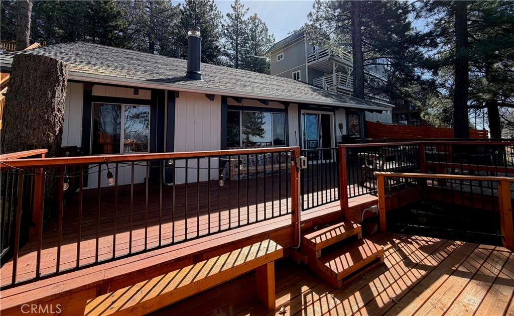 Majestic views take center stage in this charming 2-bedroom, 2-bathroom mountain cabin, offering the perfect blend of comfort, character, and outdoor living. Tucked below street level for added privacy, the home features off-street parking for multiple vehicles and a paver landing leading to the entry of this single-level retreat. Inside, you’ll find knotty pine vaulted ceilings and a stunning stone hearth fireplace that anchors the living space with warmth and rustic elegance. The layout includes a guest bedroom and full bathroom off the living room, while the primary suite offers its own bathroom with a beautifully tiled walk-in shower. The kitchen features an eat-at bar and convenient laundry area, making everyday living easy and functional. Step outside to truly appreciate the setting with a gorgeous newer main deck and an additional tiered deck below—perfect for sunbathing or soaking in the views. The side yard with picnic area is ideal for summer BBQs and outdoor gatherings. Situated on a spacious 13,056 sq ft lot, the property also includes a fenced backyard and numerous upgrades such as a newer water heater, HVAC system, roof, and decking—offering peace of mind for years to come. Located just minutes from the local ski resort and scenic hiking trails, this home is perfect for full-time living or a relaxing weekend getaway in the mountains.