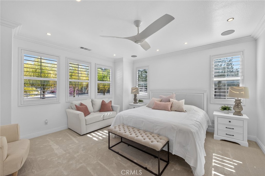 Welcome to this beautifully upgraded former model home, perfectly situated on a desirable corner lot featuring 4 bedrooms and 3 full bathrooms. Designed with style and functionality in mind, this home showcases premium finishes and thoughtful upgrades throughout such as crown molding, new sliders, plantation shutters, and ceiling fans in all the rooms. Step inside to discover a bright, open floor plan with designer touches, upgraded flooring, and elegant details that reflect its model home status. The spacious living areas flow seamlessly into the kitchen and dining spaces, creating an ideal layout for both everyday living and entertaining. The living room offers a surround sound system that is perfect for movie nights or enjoying your favorite music. One of the standout features is the convenient downstairs bedroom and full bathroom, perfect for guests, multigenerational living, or a private home office. Upstairs, you’ll find additional generously sized bedrooms and comfortable living space designed for relaxation. The primary suite offers plenty of natural light and a custom built closet. Enjoy energy efficiency with paid solar, helping keep utility costs low while living sustainably. Outside, the corner lot location provides added privacy and curb appeal, with extra outdoor space to relax, entertain, or design your dream backyard. The backyard is already equipped with a beautiful custom bar and covered patio with a ceiling fan. This exceptional home blends modern comfort, smart energy features, and designer upgrades—all in one incredible package.