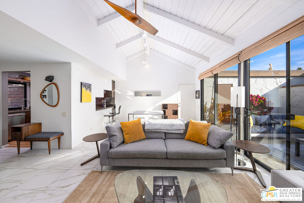 Located in the desirable community of Canyon Sands, this single-level condo features 2 bedrooms and 2 bathrooms with a large private patio with retractable awning that expands your living space to both indoors and outdoors. This condo only has one common wall and that’s in the garage. The main living area features tall cathedral beamed ceiling, dual-pane sliders and brick gas fireplace. Spanning the entre back wall, the sliders allow natural light throughout the room and access to the expansive private patio. The renovated kitchen has been updated with stainless steel appliances, quartz countertops, modern cabinetry. The primary bedroom includes a large en-suite bathroom with walk-in shower and walk-in closet. The guest bedroom is down the hall with nice separate of space, and an adjacent bathroom with shower and tub. The two-car attached garage is insulated against the elements and includes full-size washer and dryer, built-in storage cabinets, tankless water heater and an EV CAR CHARGER. HOA dues include water/sewer, trash removal, cable TV and Internet Service, exterior building maintenance (including roof) and earthquake insurance. The reasonable land lease extends through 2061, and 30-day minimum rentals are allowed. As a resident of Canyon Sands, you will enjoy professional on-site management, 7 pools and spas, 2 saunas and 5 championship tennis courts and 3 pickleball courts, all within a beautiful setting and community.