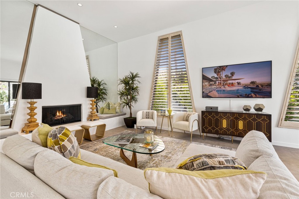 Rooted in the architectural language of 1960s modernism, this newly reimagined Indian Wells residence is a striking interpretation of mid-century design defined by bold geometry, dramatic volumes, and seamless indoor-outdoor living. Towering walls of glass flood the great room with natural light, revealing soaring ceilings, curated art walls, and sweeping desert and mountain views. A teak-clad chef’s kitchen appointed with Thermador appliances and an adjacent den overlook the living space, enhancing the home’s sense of scale and connection. Comprehensively renovated in 2022, the property blends refined materials with an effortless, livable elegance. Outdoors, a newly designed saltwater pool and oversized 12-jet spa are set within lush, private grounds featuring mature desert landscaping and citrus trees including grapefruit, lemon, lime, and kumquat. The primary suite is a tranquil retreat, opening to expansive mountain views with direct access to the pool and a private outdoor shower. The spa-inspired bath is richly appointed, complementing the home’s elevated yet relaxed aesthetic. Offering four bedrooms (one currently styled as a den/office) and four baths, the residence also includes custom teak cabinetry, generous storage, a walk-in pantry, laundry room, indoor and outdoor fireplaces, an outdoor bar with built-in BBQ, and an oversized 2.5-car garage. Set on one of the area’s most desirable streets, moments from Indian Wells Country Club, El Dorado, and The Vintage, this exceptional property captures the essence of private desert resort living, sophisticated, serene, and distinctly timeless.