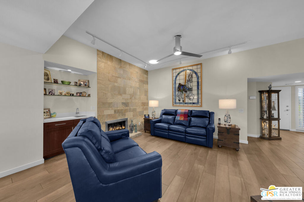 This is a very rare and desirable unit in Waverly Park because it has its own private entrance courtyard entrance with electronic gate entry located off of Birdie Way. This warm and inviting contemporary condo, recently remodeled and highly upgraded, has new porcelain floors throughout, a floor to ceiling stacked stone gas fireplace, wet bar, sophisticated bathrooms, an inviting private interior patio, ceiling fans, plantation shutters, frosted glass sliding doors in bedroom closets, dual glazed tinted vinyl windows, top of the line Dave Lennox series HVAC system (4 ton) unit with induction variable speed motor, a mini split HVAC in the primary bedroom and much more! There is an attached two car garage with direct kitchen access and ample storage. Gated Wavery Park is located in desirable South Palm Springs and is absolutely beautiful! There are three pools in addition to spas and tennis courts. Best of all this unit is on Fee land (that is land you own — no Indian Land Lease).