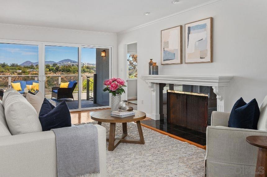 Nestled on a canyon lot, this airy and inviting Talmadge home offers panoramic views and beautifully landscaped front yard with excellent curb appeal. Step through the charming stained-glass front door into a formal entry, where your gaze is immediately drawn to the sweeping canyon beyond. Hardwood floors and warm wood trim flow throughout the home, complementing the cozy fireplace in the living room. The spacious primary suite features a recently remodeled bathroom blending comfort with modern style… Lovely kitchen offers abundant cupboard and counter space and eating bar, and opens to a cheerful breakfast room with a large picture window framing the canyon view. Sliding glass doors from the living room lead to an expansive deck, with a sleek plexiglass view through railing, perfect for entertaining. Additional highlights include a direct-entry garage (with Tesla wall charger) and thoughtful layout, ideal for both relaxed family living and lively gatherings.