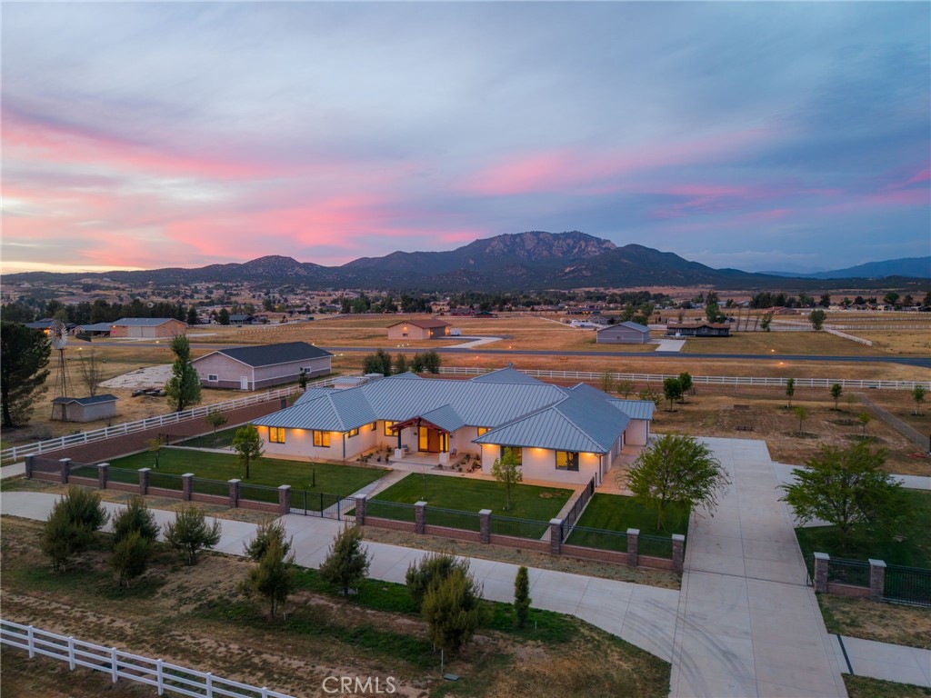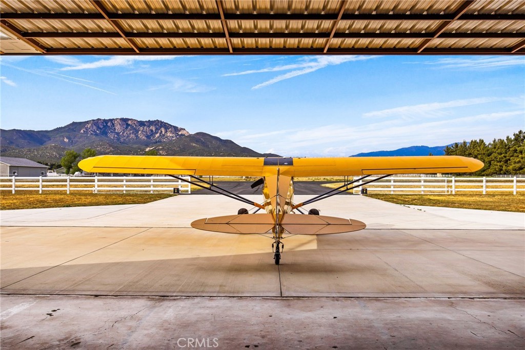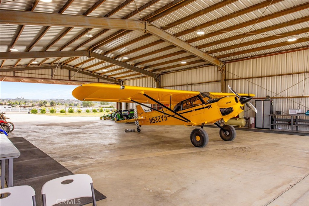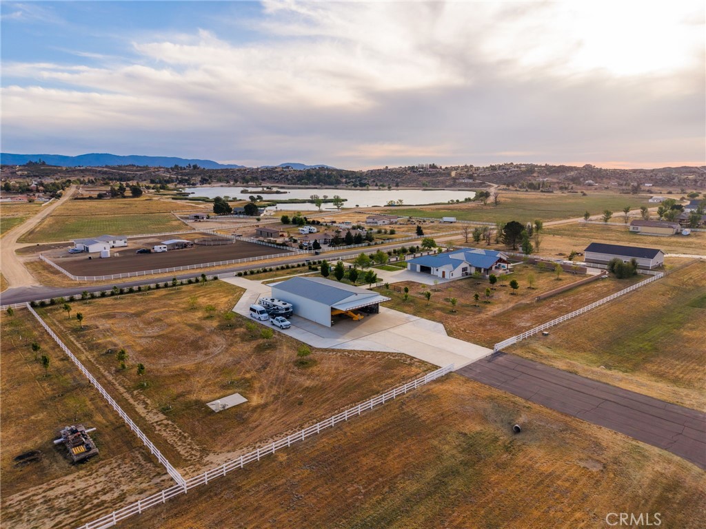 Elevate your lifestyle with this aviation home and hangar on 5.38 acres in Lake Riverside Estates, a historic equestrian and aviation community. Nestled between the Mountains and a Private Lake, find paradise. This turnkey property includes a 3,750 sq ft steel hangar with motorized 47′ and 45′ hydraulic doors, direct concrete taxiway access to a 3,600′ lighted, paved airstrip with VASI and helipad, and a newer, high-quality 4-bedroom, 3-bathroom residence built in 2022. The grounds feature manicured lawns, trees, expansive parking, concrete pathways, vinyl fencing, motorized gates, and decorative wrought iron with stacked stone cross fencing. The home showcases smooth stucco, steel-insulated roof, solid mahogany doors, a grand entry, and expansive indoor–outdoor living spaces with 12′ and 8′ trackless doors to a large, covered patio. No expense was spared on design, construction and materials. The chef’s kitchen offers a quartzite waterfall island, floor-to-ceiling cabinetry, double Sub-Zero refrigerators, a 6′ Wolf range with BBQ, a walk-in pantry with a deep freeze, and a wine fridge. Five-and-a-half-foot hallways lead to four bedrooms, a dedicated laundry/storage room, and a primary suite with a walk-in closet and retreat-style bath featuring a 16’×8′ tiled shower and claw-foot tub. Additional features include two 5-ton heat pumps, solid brass hardware, plantation shutters, auto-raising shades, custom closet systems in all bedrooms, a 1,140 sq ft finished garage with built-in cabinetry, epoxy flooring and ensuite bathroom, a security system with server, owned solar panels with backup power, and a private office. Lake Riverside Estates offers miles of riding trails, a community arena, a 55-acre lake with trails, a lakeside tot lot, sports courts, a community pool, and HOA-maintained roads; this property sits on paved roads with expansive mountain views and open space, just 25 minutes from Temecula and convenient to Idyllwild, Palm Desert, and Julian. This is a rare California opportunity to own a premier airpark and equestrian lifestyle within a single, cohesive compound.