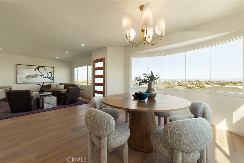 Perched above the coastline in the Upper Hollywood Riviera, 512 Via La Selva showcases Queen’s Necklace and expansive city views. This thoughtfully reimagined home offers a sense of openness and is designed for comfort and connection—defining the best of coastal South Bay living. The main level features an open living and dining area filled with natural light, framed by panoramic ocean and city skyline views as a dramatic backdrop stretching across DTLA and beyond. Large windows and an open layout connect the interior spaces to the surrounding views, making the home equally well suited for everyday use and entertaining. The well-appointed kitchen opens directly to the family room and rear yard, creating a functional and inviting flow throughout the floor plan. The kitchen features custom cabinetry, Calacatta Taj honed quartz countertops, gourmet stainless steel appliances, a welcoming breakfast nook, and a large peninsula that serves as a natural gathering space. Three well-proportioned bedrooms are located on the upper level, providing comfortable and private accommodations. Each bathroom has been tastefully updated with clean, contemporary finishes, including porcelain and terrazzo flooring, that complement the home’s overall design. Neutral tones continue throughout the home, highlighted by luxury vinyl plank waterproof flooring. The lower level provides a secluded primary retreat with flexible bonus space, ideal for a home studio, creative space, gym, or secondary lounge—well suited for today’s evolving lifestyles. Outdoors, the property features fresh landscaping, a patio area, and a spacious, flat, and usable rear yard designed for entertaining, recreation, and relaxation. Ideally located just minutes from world-class beaches, scenic coastal trails, award-winning schools, and the dining and boutiques of Riviera Village, this home offers a rare balance of privacy, convenience, and setting. Few places compare to the Riviera lifestyle.