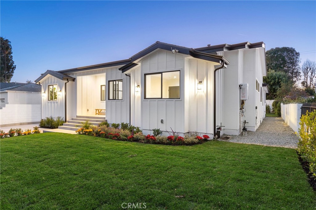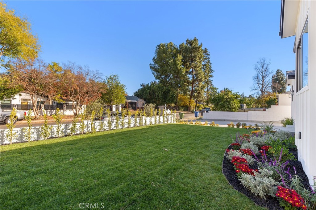 Striking single-story modern farmhouse set on a quiet, tree-lined street in prime Sherman Oaks. A striking exterior with clean architectural lines and a wide driveway creates an immediate sense of arrival, complemented by lush landscaping and warm curb appeal. A covered entry opens to a thoughtfully designed interior where elevated ceilings, wide-plank European oak floors, and curated finishes define the space. The expansive great room seamlessly connects living and dining areas, anchored by custom built-ins and flooded with natural light. The chef’s kitchen is both functional and refined, featuring stone countertops, premium stainless steel appliances, and a generous center island with bar seating, ideal for everyday living and entertaining alike. The primary suite is a private retreat, complete with a spacious walk-in closet and a spa-inspired bathroom offering a soaking tub, oversized glass shower, and dual vanity. The backyard is designed for effortless California living, with a covered patio and expansive grassy yard—perfect for entertaining, relaxing, or outdoor dining. A versatile rec room offers flexibility for a home office, gym, media room, or playroom. Additional highlights include a security system with cameras, alarm, and smart home pre-wiring. Ideally located moments from Ventura Boulevard’s premier dining, shopping, and lifestyle amenities, this home delivers modern comfort with timeless appeal.