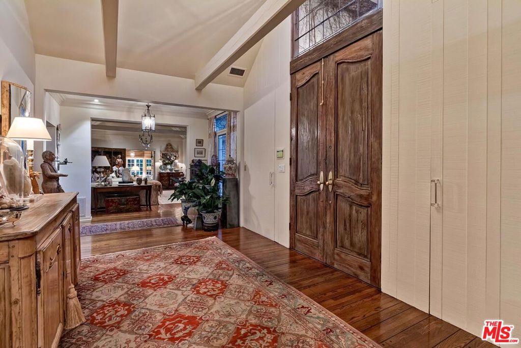 Enter the gated slate motorcourt before stepping into this enchanting secluded wonderland in the heart of the Flats and be prepared to escape from the city. For the first time in 61 years, a fortunate buyer will be able to experience this spacious gated/hedged 1sty European Villa as their new 5-star resort-style home. This designer-curated masterpiece expertly achieves a dramatic level of timeless taste. Super high vaulted ceilings, skylights, beams, exquisite wood flooring, built-ins, custom paneling, and French doors are featured in multiple spaces. Grand entry foyer flows easily to the public rooms for maximum entertaining capacity. The living room with vaulted beamed ceilings leads to a gracious den/library which opens to charming brick patios surrounding an inviting fountained pool. Two other substantial entertaining yards exist with one private in the front and one central slate courtyard accessed by the dining area and primary suite. Sizable skylit cook’s kitchen with top stainless appliances and pantry areas. The enormous primary suite featuring dramatic high vaulted beamed ceilings contains a large sitting area, fireplace, dual baths, dual walk-ins, and direct access to the inner slate courtyard. An adjacent den/office can readily be utilized as a convertible 4th bedroom. One other guest bedroom suite exhibits the size of another primary suite and also includes a sitting area. With over 130 feet of gated frontage featuring mature hedging along with being prominently located on a fantastic corner lot on one of the most prestigious tree-lined roads in the Flats of Beverly Hills, this gem is moments from the best of Beverly Hills and the Westside. Trust Sale.