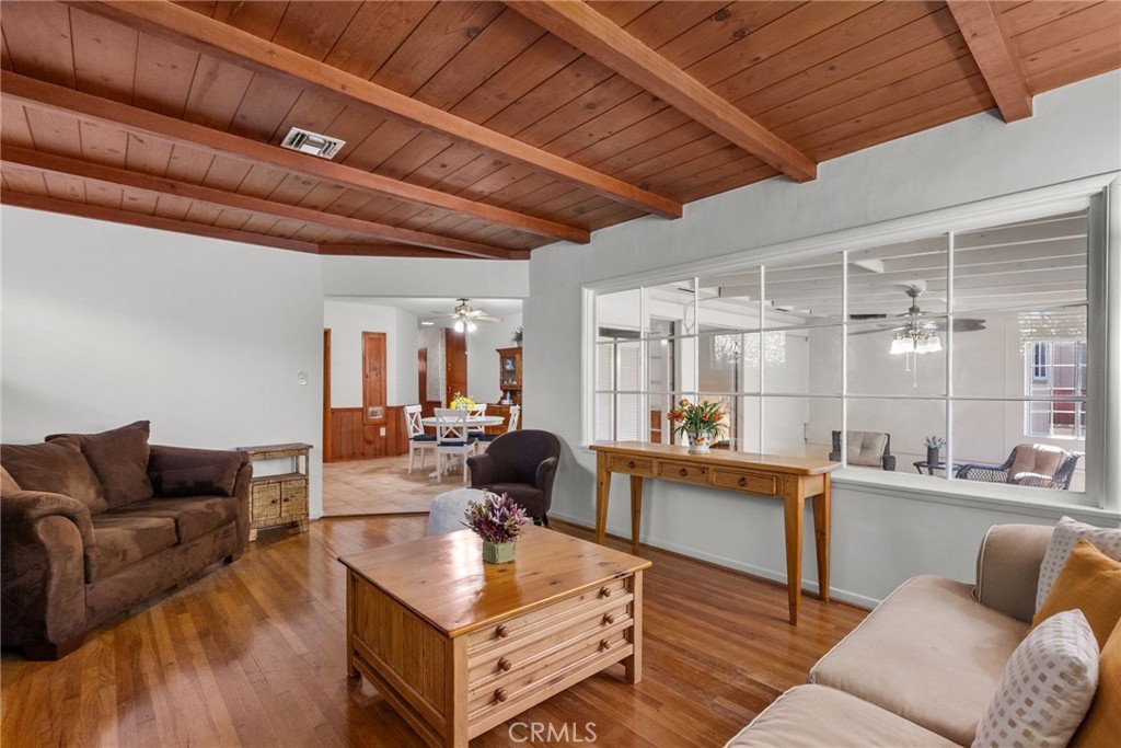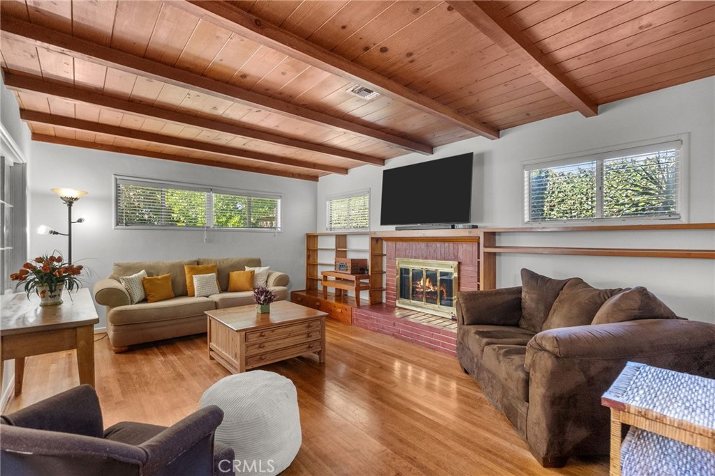 Welcome to this inviting Valley Glen charmer where warmth, character, and comfort intertwine. From the moment you arrive, the home’s inviting curb appeal catches your eye — a classic ranch silhouette framed by lush landscaping, brick-lined walkways, and vibrant greenery that create a warm first impression. Step Inside, sunlight dances across warm hardwood floors, highlighting a spacious living room with rich tongue-and-groove wood ceilings and a brick-trimmed fireplace that instantly feels like home. The open dining area flows effortlessly into a bright country-vintage inspired kitchen with custom solid-wood cabinetry, and a layout that invites conversation while cooking. The primary suite serves as a peaceful retreat, while the secondary bedroom is equally versatile—ideal as a guest room or home office. Both bathrooms retain a nostalgic charm while offering plenty of functionality.. Step into the sunroom—a delightful bonus space wrapped in windows and natural light—perfect as a morning coffee nook, reading lounge, or creative studio. Out back, discover the meticulously manicured outdoor sanctuary featuring a lush grassy yard framed by mature greenery, a delightful pergola adorned by deep-purple Bougainvillea, a majestic orange tree, and a covered patio ideal for outdoor dining and weekend gatherings. The extended driveway provides plenty of extra parking in addition to the attached two-car garage which also offers workspace and ADU potential. Perfectly located near NoHo West Shopping Mall, Trader Joe’s, LA Fitness, restaurants, local cafes, parks, and major freeways, this home offers both tranquility and convenience—an opportunity to enjoy today and reimagine tomorrow.