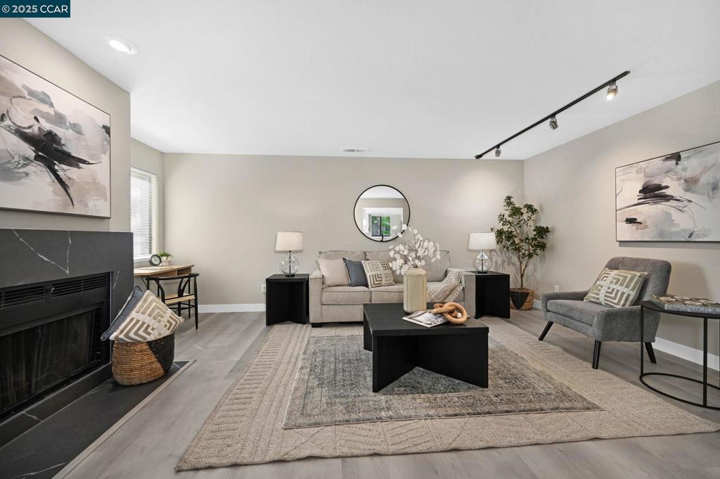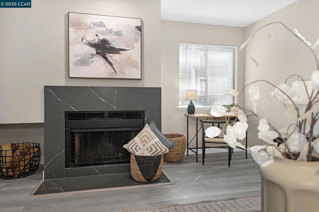 Open Sunday, 1-4! Beautiful Level Ground Floor, NO Steps. Corner Unit in a tranquil, wooded location. Remodeled throughout. Sharp, open kitchen with quartz countertops, white shaker cabinets and stainless-steel appliances including a gas range. Two remodeled bathrooms with quartz countertops. Large primary bedroom suite plus a second bedroom with full bath. Full sized laundry closet inside the unit. Spacious living room with cozy wood burning fireplace. Modern touches throughout, including LVP flooring, lighting and fixtures. Freshly painted. Pleasant views of green-belt and park. Large one-car garage with ample storage, plus assigned parking space. Wonderful, private backyard deck overlooking the trees and green belt. Convenient location with proximity to shopping, restaurants and easy commutes with Hwy 4 and I-680 nearby. Just across the street from Holiday Highlands Park.