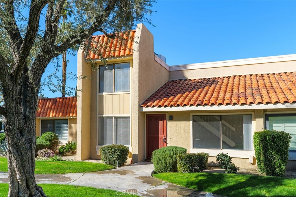 This Property is FEE Simple and not land lease. Welcome to this inviting 3-bedroom, 2-bath townhome located in the desirable gated community of Rancho Mirage. Surrounded by beautifully maintained grounds, lush greenbelts, and mature landscaping, this home offers comfort, convenience, and peaceful resort-style living in the heart of the desert. The spacious living room features vaulted ceilings, creating an open and airy atmosphere filled with natural light. The thoughtfully designed floor plan includes a downstairs primary bedroom, offering ease and privacy. Upstairs are two additional bedrooms and a full bathroom. The kitchen offers ample cabinet space, a breakfast bar, and stackable washer and dryer hookups for added convenience. Adjacent to the kitchen is a separate dining area, ideal for entertaining or everyday meals. Central air and heat ensure year-round comfort. Step outside to a private, enclosed patio, perfect for relaxing, outdoor dining, or enjoying the desert sunshine. The unit also includes a one-car carport. Residents of this well-maintained community enjoy exceptional amenities including five sparkling swimming pools and spas, tennis and pickle ball courts, and a clubhouse, all within a secure gated setting. Ideally located close to shopping, dining, golf courses, and Eisenhower Medical Center, and just minutes from downtown Palm Springs and the Coachella Valley, this townhome is perfect as a full-time residence, seasonal retreat, or investment opportunity. HOA dues cover internet, trash, exterior insurance, roof maintenance, and common area upkeep, providing excellent value and peace of mind.