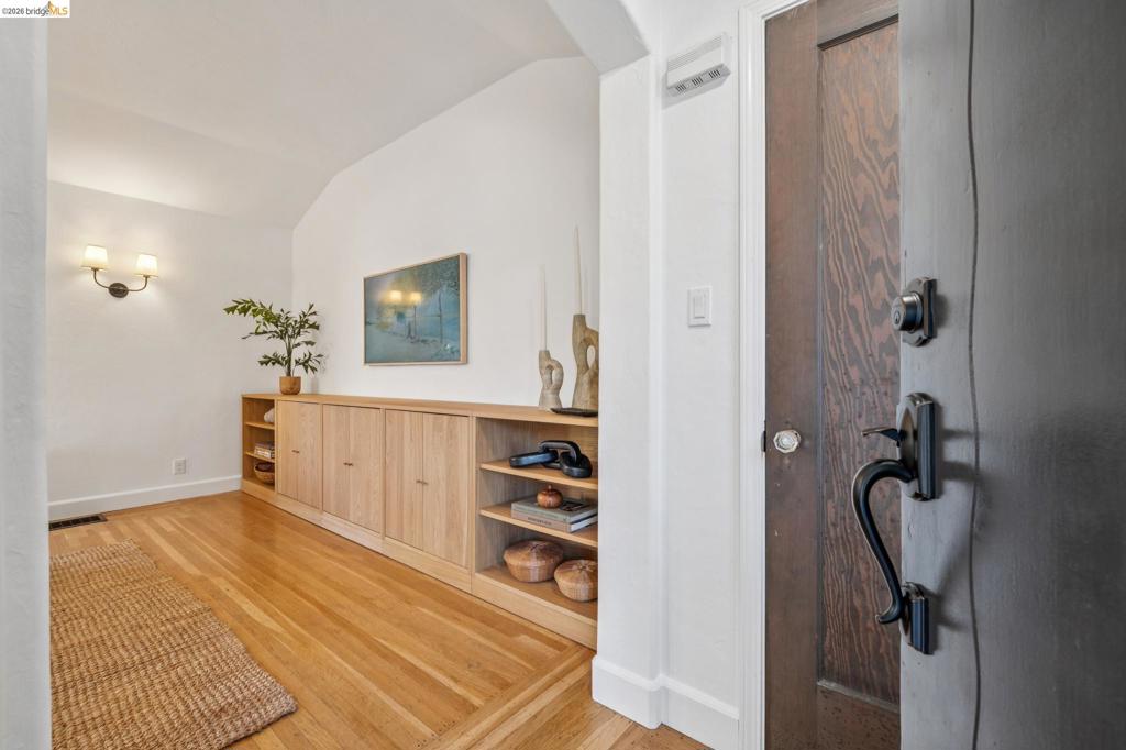 On a long, tree-lined block in the heart of Estudillo Estates, this beautifully updated Spanish-style home blends timeless architecture with thoughtful modern upgrades. Arched doorways, warm hardwood floors, & abundant natural light create an inviting living space. The living room features a classic fireplace, custom built-in cabinetry, & a striking statement light fixture. The spacious dining room flows seamlessly into the remodeled kitchen with European cabinetry, Heath ceramic tile, a custom plaster range hood, and a mix of open and closed shelving. A charming dining nook surrounded by windows sits beside the glass back door, filling the kitchen with natural light. Upstairs, two bright bedrooms with custom ELFA closet systems share an updated bathroom. The lower level features an additional bedroom, updated bathroom, and a remodeled laundry area that can also serve as a work-from-home space, with access to the garage and backyard. The backyard offers multiple seating areas, a lush lawn, paver patio, outdoor shower, and detached 115 sq ft bonus studio. Mature hedging creates privacy while a flowering cactus adds character to the garden. Additional highlights include seismic retrofitting, central air conditioning, EV charging, & low-maintenance landscaping with drip irrigation.