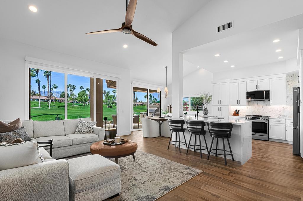 DON’T MISS THIS OPPORTUNITY!A truly rare offering where every detail has been thoughtfully curated for comfort, style, and effortless living. This beautifully remodeled three-bedroom, two-bath condo (1,627 SF) is offered turnkey furnished, making it immediately ready for your personal enjoyment.Ideally positioned in a prime location, the home captures panoramic mountain and double fairway views, creating a stunning backdrop for everyday living.Designed for seamless indoor-outdoor living, the Cottonwood floor plan features an open-concept layout filled with natural light. The chef’s kitchen has been fully upgraded with custom cabinetry and a striking Quartz waterfall island, perfect for gathering and entertaining.Step outside to a generously sized tiled patio, where a newly constructed privacy wall with built-in BBQ, automated shades add both comfort and convenience, allowing you to enjoy the space year-round.Additional highlights include a two-car air-conditioned garage with epoxy flooring and an electric vehicle charger, blending practicality with modern convenience.Properties of this caliber rarely become available. Don’t miss the opportunity to own a fully dialed-in desert retreat.Schedule your private showing today.