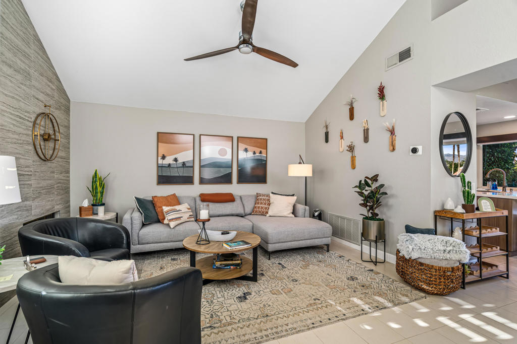 Located within the Oasis Country Club, this beautifully appointed two-bedroom, two-bath residence offers an elevated desert lifestyle. Professionally decorated and thoughtfully upgraded, the home features tile flooring throughout, custom paint selections, electric window shades, and a fully remodeled kitchen enhanced by modern cabinetry–each detail contributing to both comfort and polished presentation.An inviting gated courtyard sets the tone upon arrival, offering a truly pet-friendly environment with a dedicated grass area, abundant natural sunlight, and a tiled walkway leading to the front door. Open sight lines through the gate create a welcoming sense of openness while maintaining privacy.The flexible floor plan includes an upstairs primary suite with the addition of an extra-large walk-in closet, while the downstairs bedroom may also function as a primary suite or private guest retreat. Positioned directly on the golf course, the home enjoys sweeping mountain, fairway, and lake views.Additional highlights include an epoxy-finished garage and a turnkey offering that is completely furnished for immediate enjoyment. Residents of Oasis Country Club enjoy access to a full suite of amenities, including championship golf, multiple pools and spas, tennis and pickleball courts, a well-appointed fitness center, and an active clubhouse with dining and social offerings. The Oasis Country Club is a lifestyle.