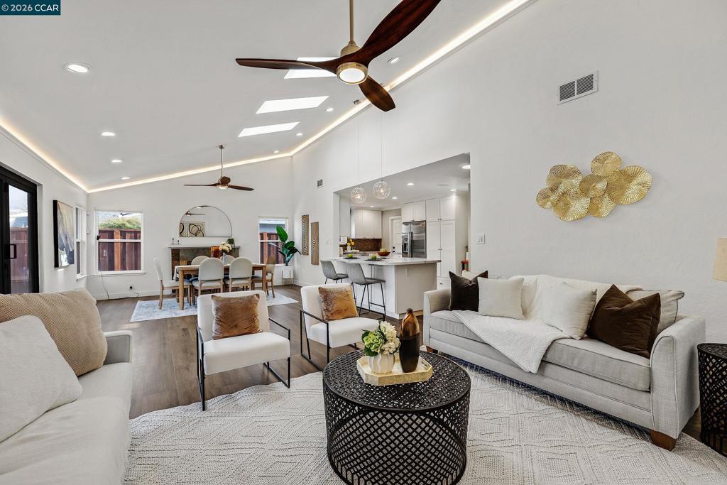 This meticulously remodeled and thoughtfully expanded 1,616 sq. ft. beauty is located just steps from San Veron Park and moments from downtown Mountain View. Highlights include a newly added 300 sq. ft. expansion, new flooring, owned solar, skylights, Hardie shiplap siding, designer lighting, and a private backyard retreat designed for indoor outdoor living. As you enter, you’re greeted by a bright, welcoming layout that opens to expansive living & dining areas filled with natural light. The living room, dining room, and primary bedroom all feature vaulted ceilings with elegant cove lighting. The home showcases a newly reconfigured open concept great room, where the kitchen flows effortlessly into the family room—creating a spacious hub for cooking & entertaining. The kitchen includes stainless steel appliances, gas stove, central island, & abundant cabinetry. A dramatic folding glass wall system opens completely to the backyard oasis. The expanded floor plan includes a luxurious primary suite, thoughtfully redesigned with a walk-in closet and a spa inspired bath featuring a soaking tub, walk in shower, and double sinks. Step outside to a private backyard retreat complete with a hot tub, mature landscaping, multiple seating areas, and ample space for entertaining and gathering.