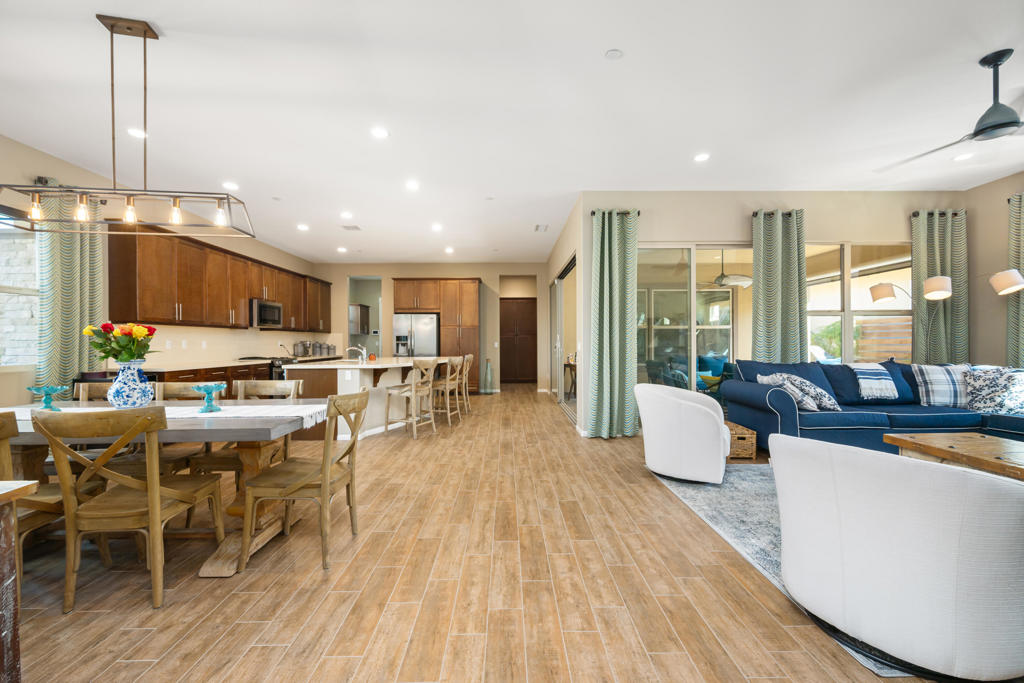 Located in the ‘all ages’ section of Trilogy Polo Club, this rarely available Solare model, with an exterior ‘desert’ elevation, features an open concept floorplan with a south-east facing greenbelt/park setting. Upgrades include a pre-paid solar lease to keep your electric bills to a minimum, a 15′ rolling wall of glass that extends your living space onto the covered & pavered patio, tile flooring throughout most of the house, recessed lighting, upgraded shaker-style cabinetry and more! To maximize privacy for your guests, the guest suite is located on one side of the home, with the guest bathroom having a ceramic tile shower-over-tub combo. The den overlooks the front patio which is connected to the side yard. The kitchen boasts a large center island and has Jenn-Air stainless steel appliances. Perfect as a home office, the smart-space/laundry room features upper/lower cabinetry and built-in desk space with drawers. The primary bathroom has dual vanities and a large tile shower with glass/stone tile accent band. To keep your belonging cool during the warmer months, the garage features a mini-split a/c unit, along with epoxy flooring and built-in storage cabinets. Furnishings are available, ask agent. Meticulously upgraded and impeccably maintained, this exceptional home shows better than a model and reflects the seller’s unwavering attention to quality and detail. Offering the ultimate in resort-style living. Call for a private showing today.