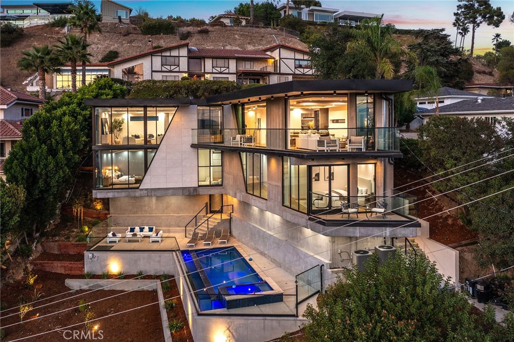 The Modern Edge of Luxury Living. An ultra-custom modern masterpiece perched in the prestigious Glendale Hills of Rossmoyne. Construction began in 2020 and was finished in 2025 resulting in a home that blends bold architectural concrete-built design with state of the art finishes. Spanning approximately 3,617 (taped) sq.ft. of main living space plus an additional 1,328 SF of finished Basement/Flex area (ideal for a theater, music studio, gym, or future creative use), the property offers a of nearly measured 4,945 total sq.ft. of space. Designed to maximize entertainment and everyday comfort, this home boasts sweeping panoramic views of Downtown Glendale, LA, and the San Fernando Valley. The entry level greets you with a striking open-concept design where the kitchen, dining, and family room flow seamlessly through multi-panel sliding doors to expansive outdoor terraces and a modern fireplace. A separate living room showcases dramatic views and includes a second fireplace perfect as a formal lounge or easily convertible to a future 4th Bed. if desired. The custom kitchen features top of the line Wolf appliances, built in refrigerator, a stylish breakfast bar, and built-in speakers and sleek powder room for guests. A sculptural staircase with custom finishes and chandelier connects all levels with elegance. The second-floor hosts third bedrooms, each with private en-suite bathrooms and inspiring city views. The luxurious primary suite is a true retreat with an oversized walk-in closet, sitting area, spa inspired bathroom with jetted tub, dual vanities, walk-in shower, and a private balcony. A large laundry room and a separate utility room add convenience. The third level offers a finished basement/ Flex area spanning 1328 Sq.ft, providing endless opportunities for a home theater, gym, music studio, game room Additional area for wine cellar, or storage the ultimate space to bring your imagination to life. Outdoors, a fully landscaped yard is highlighted by a zero-edge infinity pool and spa, with expansive seating and entertainment areas to enjoy the breathtaking skyline and valley views. Add. features include dual-zoned HVAC, two tankless water heaters, a full fire sprinkler system, engineered wood flooring, premium fixtures, sump pump drainage, and an attached two-car garage. This is a once in a lifetime opportunity to own one of Glendale’s most stunning modern residences, designed for luxury living and spectacular entertaining.