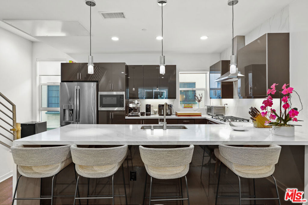 Welcome to 8408 Blackburn Ave a beautifully crafted 3-bedroom, 3.5-bathroom modern home built in 2019, nestled in one of LA’s most coveted neighborhoods just south of 3rd Street in Beverly Grove. Part of the 10 Blackburn small lot subdivision, enter on the ground floor to find a private guest bedroom with its own en-suite bath featuring a walk-in shower, then head upstairs to the bright and open main living level where an elegant dining room, spacious family room, and a generous kitchen with GE Profile appliances and ample cabinetry come together seamlessly with a balcony off the dining area and a powder room completing the floor. The third floor is home to two additional bedrooms, including a serene primary suite with a walk-in closet, double vanity, walk-in shower, and private balcony, while the secondary bedroom offers its own en-suite tub/shower bath, and a stacked washer/dryer and built-in storage closet add everyday convenience. All bathrooms are appointed with dimmable LED-lit vanity mirrors, custom window treatments are found throughout, and three motorized shades on the soaring high-ceiling transoms add a seamless finishing touch. Above it all, a professionally turfed rooftop deck with a wind-sensor retractable awning and stunning views of the Hollywood Sign offers the ultimate LA outdoor living experience. The attached 2-car garage features epoxy floors and an EV charging station, and the unbeatable location puts you steps from Joan’s on Third, Oste, Izakaya, Bacio Di Latte, and the best of 3rd Street dining and shopping, a 5-minute walk to the Beverly Center, and a 10-minute walk to The Grove and the soon to be brand new, largest Whole Foods on the West Coast a rare turnkey modern home that truly has it all.