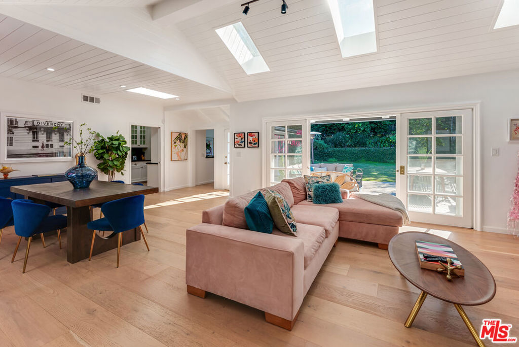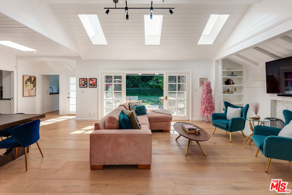 Meticulously renovated, quintessential Beverly Hills bungalow tucked away on a quiet cul-de-sac and securely placed behind gates. An impressive open-concept living and dining room showcases a cozy fireplace and dramatic vaulted ceilings dotted with skylights, welcoming an abundance of natural sunlight throughout. The chef’s kitchen is fully equipped with top-of-the-line appliances, including an expansive wine refrigerator, and a cozy breakfast nook framed by sliding doors that seamlessly integrate indoor-outdoor living. The primary suite, privately located on the far wing of the home, is a true sanctuary, offering an extensive walk-in closet and a spa-like en suite. Three additional bedrooms, all generous in size with their respective en suites, complete this highly functional floor plan. Enjoy a meal al fresco in the outdoor dining area, gather around the fire pit, and pick your own citrus, all within this lush grassy oasis privately framed by mature landscaping. A true rarity a fully renovated residence of this caliber in one of the most highly coveted locations.