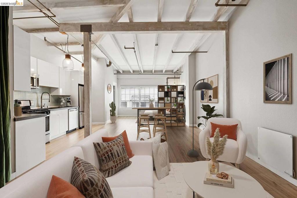 This live/work loft offers a highly functional layout with a dedicated ground-floor workspace and a bright, open living area above-designed to adapt to real daily needs. The street-level workspace features a roll-up door and curb cut access, making it easy to move equipment, materials, or gear in and out. With durable finishes, built-in storage, and generous ceiling height, it’s a space suited for projects, hobbies, or a flexible work-from-home setup. Upstairs, the living space is open, comfortable, and filled with natural light. Warm wood floors, exposed beams, and clean finishes create a setting that feels both practical and inviting. The kitchen connects directly to the main living area, supporting an easy flow for cooking, dining, and relaxing. The separation between levels allows for focus and privacy when needed-work below, live above-without sacrificing connection between the spaces. Additional nooks and storage areas provide flexibility for workspace or organization. The community includes a landscaped courtyard, BBQ/picnic area, and secured gated parking with two spaces. Just minutes from BART, downtown Oakland, and Emeryville, this is true loft living-industrial charm meets modern comfort in one of the East Bay’s most connected locations.