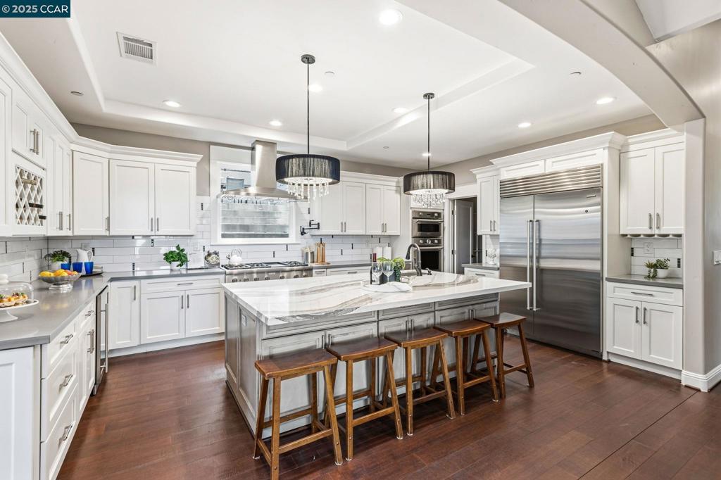 Experience modern luxury and stunning open-space views at 961 Oak View Circle. Nestled on a quiet Lafayette cul-de-sac, this contemporary 5-bedroom, 4.5-bath residence offers elegant design, exceptional craftsmanship, and a seamless indoor-outdoor lifestyle. The light-filled open floor plan features soaring ceilings, wide-plank hardwood floors, and walls of glass framing breathtaking hillside vistas. The chef’s kitchen boasts a 48” Sub-Zero refrigerator, Wolf 6-burner range with griddle, dual ovens, large island, and walk-in pantry — perfect for entertaining or family living. Sliding doors open to expansive decks. The backyard retreat includes a multi-purpose sport court, spa, and beautifully landscaped areas designed for recreation and tranquility. The primary suite offers vaulted ceilings, a spa-inspired bath, and private terrace views. Additional en-suite bedroom and flexible space to accommodate guests, a home office, or gym. Additional highlights include an elevator from the garage to the main living level, multiple fireplaces, custom lighting, and designer finishes throughout. Situated on a generous .37-acre lot, this home combines privacy and convenience — close to Lafayette’s award-winning schools, downtown dining and shops, BART, trails and freeway access.