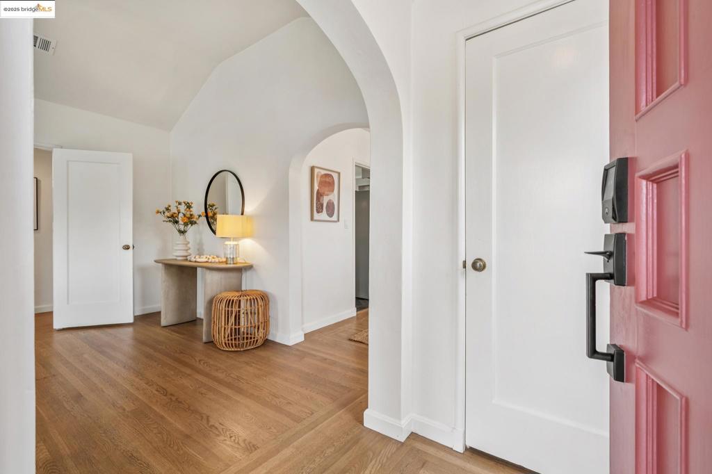 Sitting on a large corner lot in San Leandro’s beloved Broadmoor neighborhood, 999 Alice Ave is a 1938 bungalow that beautifully blends timeless charm with smart upgrades and incredible outdoor living. The striking exterior features a bold modern color palette, brick chimney accents, and an inviting arched front door. Inside, restored white oak floors and a soaring 10-foot barreled ceiling bring warmth and character, while updates like dual-pane windows, upgraded electrical, and a new HVAC system with central A/C make life easy. The remodeled kitchen offers radiant heated floors and French doors that open to a spacious redwood deck. The backyard is designed for entertaining with a grassy lawn, sleek paver patio, and mature grapefruit, orange, and fig trees, all framed by tall redwood fencing for added privacy. The detached garage provides a Tesla EV charger and the flexibility to convert into a workspace, while a side shed and newly built concrete pad allow for even more storage potential. The home is perfect as is, yet the expansive front yard offers opportunity for future fencing, expanded outdoor living, or even possible home expansion. With Koolfi Creamery, Top Hatters, 580, and BART all nearby, this home is move-in ready with room to grow.