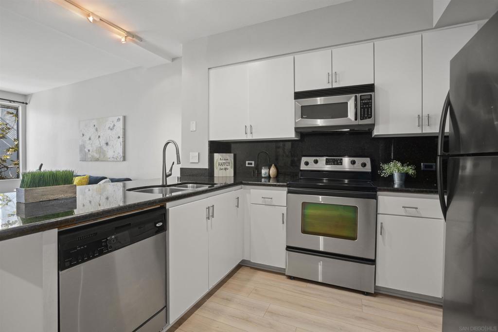 Experience refined city living in this beautifully upgraded 1-bedroom condo at ATRIA. Nestled on the 3rd floor with peaceful parklike views, this bright and airy home features an open floor plan and a spacious sunlit patio—perfect for effortless indoor-outdoor living. Recent upgrades include sleek laminate flooring and fresh designer paint, enhancing the modern aesthetic. The well-appointed kitchen boasts granite countertops, stainless steel appliances, and ample cabinetry for both style and practicality. Additional conveniences include in-unit laundry. Located in the heart of the Marina District, this exceptional residence offers the perfect blend of luxury, comfort, and walkable downtown living. Atria centrally located in the highly sought after Marina District. Completed in 2002, Atria features 149 residences in two 4-story mid-rise buildings which include 101 Market Street and 120 Island Avenue These ultimate addresses offers easy access to the best the city has to offer, including Petco Park, Seaport Village, and the Gaslamp District for entertainment, dining, and shopping. Atria amenities include contemporary lobby, Secure Gated Building, state-of-the-art fitness center, business center, meeting room, two rooftop lounges with BBQ’s, gated underground parking, bike storage and security, and on-site property manager.