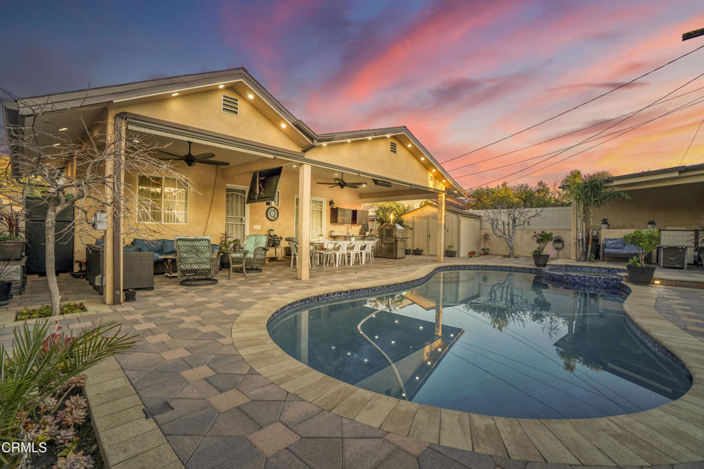 This stunning 3-bedroom, 2-bathroom home is designed for comfort, style, and family living. Fully remodeled just two years ago, the property offers thoughtful upgrades and meticulous attention to detail throughout.Step inside to find a bright and airy open- floor-plan interior. The living room is enhanced by recessed lighting and a beautifully designed bar featuring its own cabinets and a sleek peninsula. The kitchen features sleek cabinetry, high-end finishes, and plenty of storage to delight any chef. Each bedroom is a retreat in itself, with custom floor-to-ceiling closets offering ample space for everyone in the family.The outdoor spaces are an entertainer’s dream. The spacious backyard features a stunning heated saltwater pool and spa, illuminated with LED lights and completely redone just two years ago.The front and backyard have been fully paved, creating a seamless flow for relaxation, convenience, and family gatherings. The unique outdoor kitchen elevates your hosting potential, perfect for barbecues and al fresco dining. Additionally, the property boasts a variety of mature fruit trees, including persimmon. fig, mandarin, lemon, and more. These trees provide an abundant harvest and add a charming, natural touch to this already impressive outdoor spaceBeyond its immediate charm, the property offers excellent potential for an accessory dwelling unit (ADU) for added value. Whether you’re looking to raise a family or enjoy a luxurious retreat, this home blends modern upgrades with warm, inviting spaces, making it a perfect place to create lasting memories.