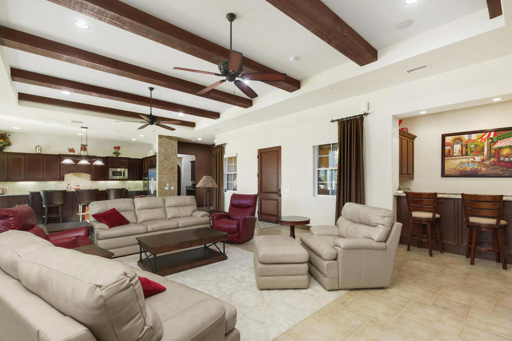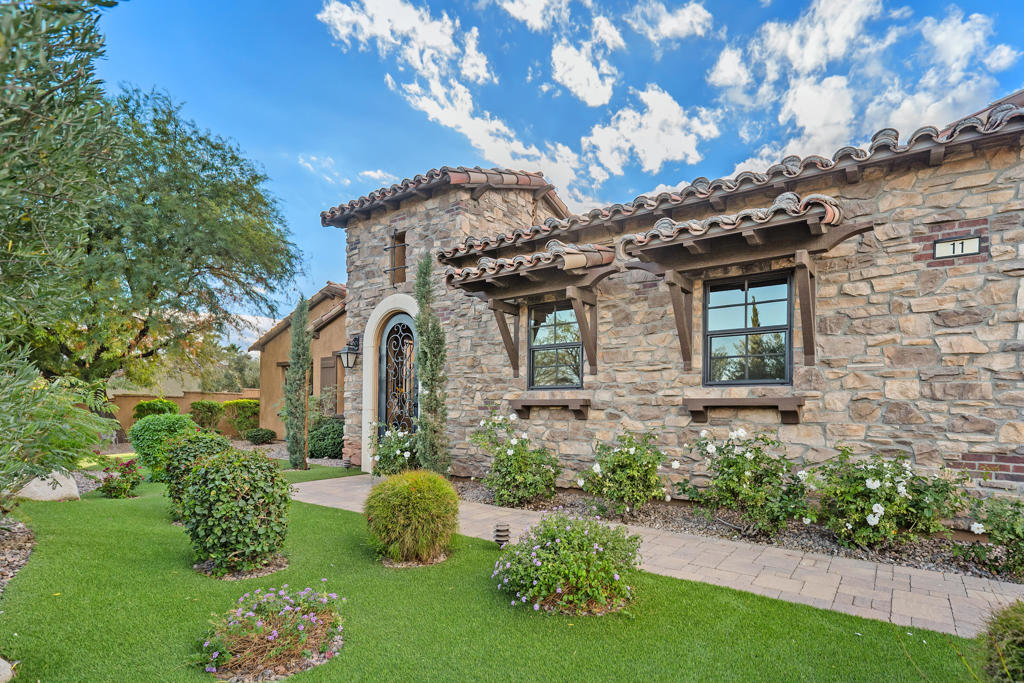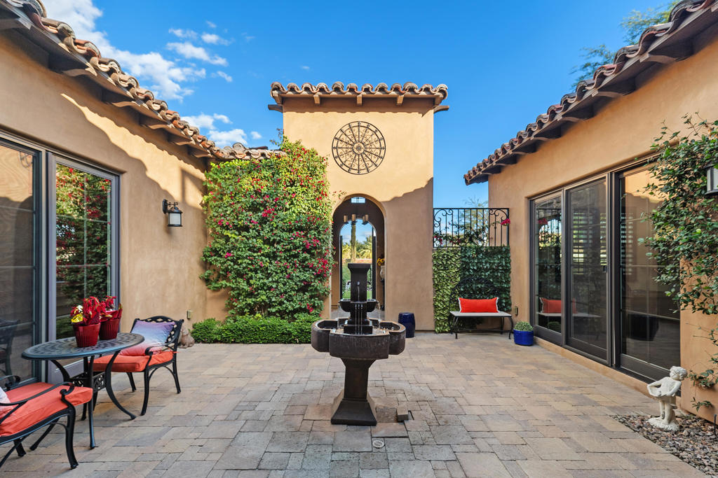 This gorgeous home with an interior location sits within the prestigious gated Escala enclave offers 4,085 sq.ft. of resort-living. Designed by Gold Nugget Award winning Architect, Mark Scheuer and built by GHA, the blend of traditional Tuscan with contemporary design makes this home an inviting blend of timeless charm. The courtyard entrance with centerpiece tiered fountain makes your every wish come true. Once inside the warm rich wood tones and stone accents accentuate the open concept floorplan. Easy entertaining with the expansive kitchen featuring long slab granite counters, travertine backsplash and plenty of cabinets. European beamed ceilings in the great room with a thermostatically controlled fireplace, wet bar and large paned windows overlooking the pool area. Tile floors in the main living space, with wood floors in the media/family room, primary bedroom and office, and carpeting in the guest bedrooms. All bedrooms have en-suites and good separation. The home office could easily be converted to a 4th bedroom. Lovely mountain views from the backyard, complete with several seating areas, an outdoor kitchen and automated patio sun screens. The pebble finish pool and spa are adorned by gas firepots and an expansive patio of custom paver stone tiles. The 3-car epoxy garage has built-in cabinets. Recent upgrades include energy efficient windows across the back of the home, on-demand tankless hot water heater and an artificial turf lawn. Prepare to be amazed!