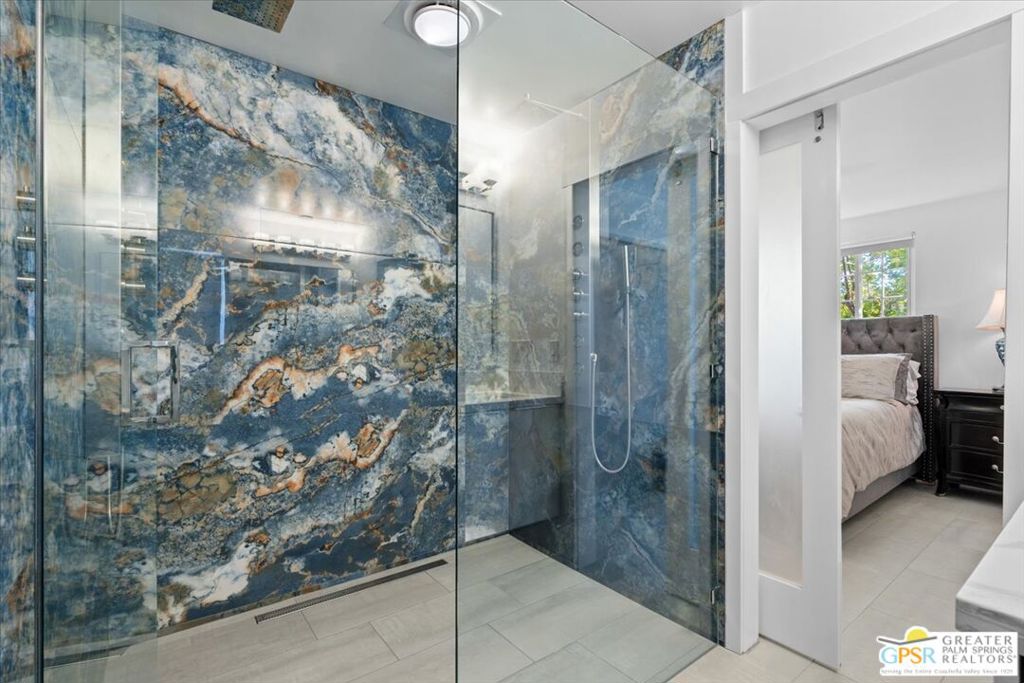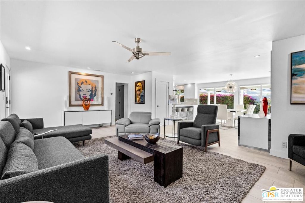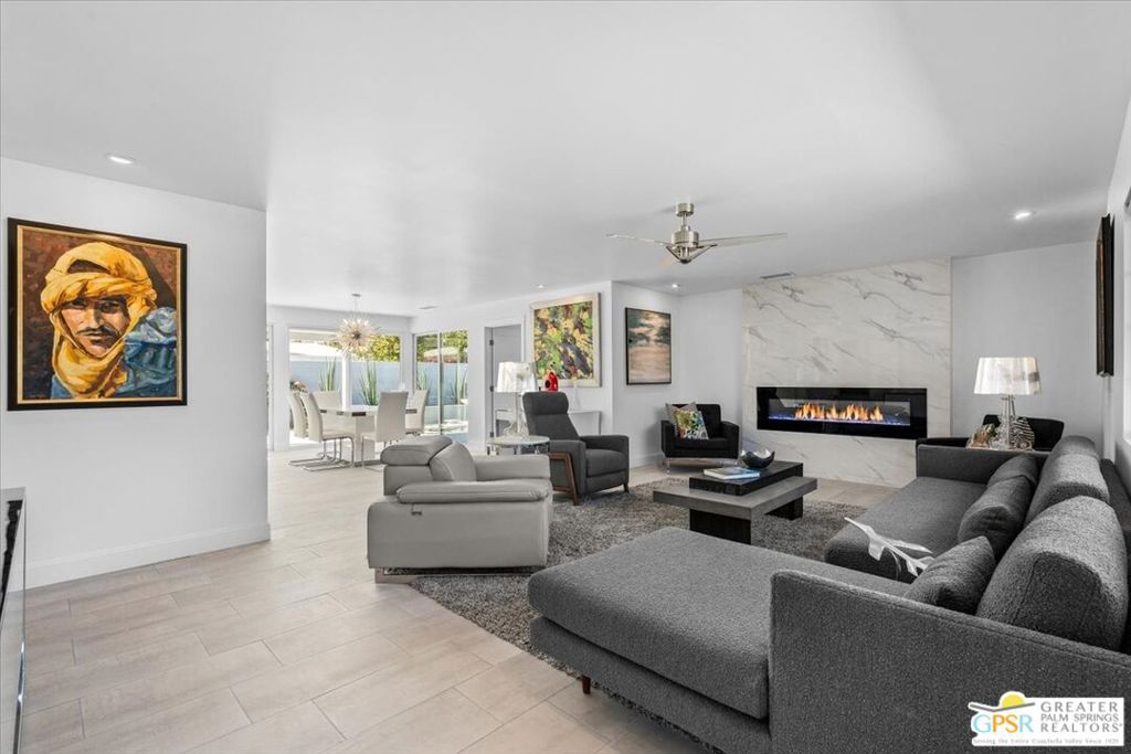 This is NOT a flip. Seller spared no expense in the remodel for his own use, but plans changed and now this gem will belong to a new lucky owner!!! The mid-century Movie Colony home underwent a complete transformation in ’23-’24 including an elegant stone exterior and the entire interior was refinished with a architectural grade-5 smooth drywall finish. Upgrades: all new doors and handles in and out, contemporary floor tile throughout, all new lighting and ceiling fans, and custom made architectural base. Four new Milgard sliding patio doors all face the majestic mountain view and a 2024-built contemporary Pebble Tech pool and spa by famed pool designer Architectural Blue with Pentair equipment. The kitchen is graced with contemporary high gloss European cabinets, quartz counters (also in 3 baths and laundry), stunning backsplash, stainless steel 36″ professional range with hood, 4-door/drawer counter-depth refrigerator and built in microwave. There are 3 ample bedrooms and 3 richly finished baths, all with double showerheads and Toto toilets. The 24′ laundry/bonus room could be a wine room, office or pantry. 16 owned solar panels from Hot Purple Energy power the 2024 electric panel and the electric car charger in the fully finished garage.